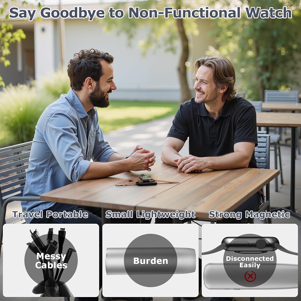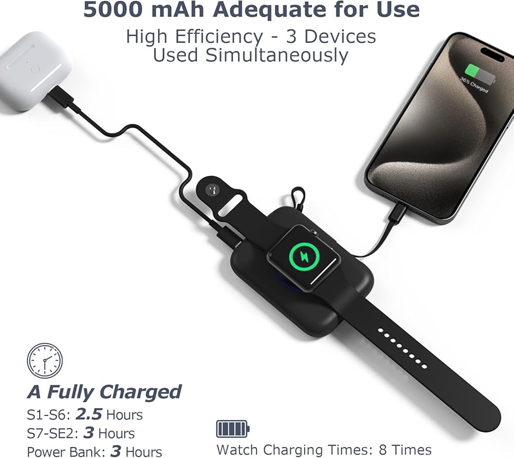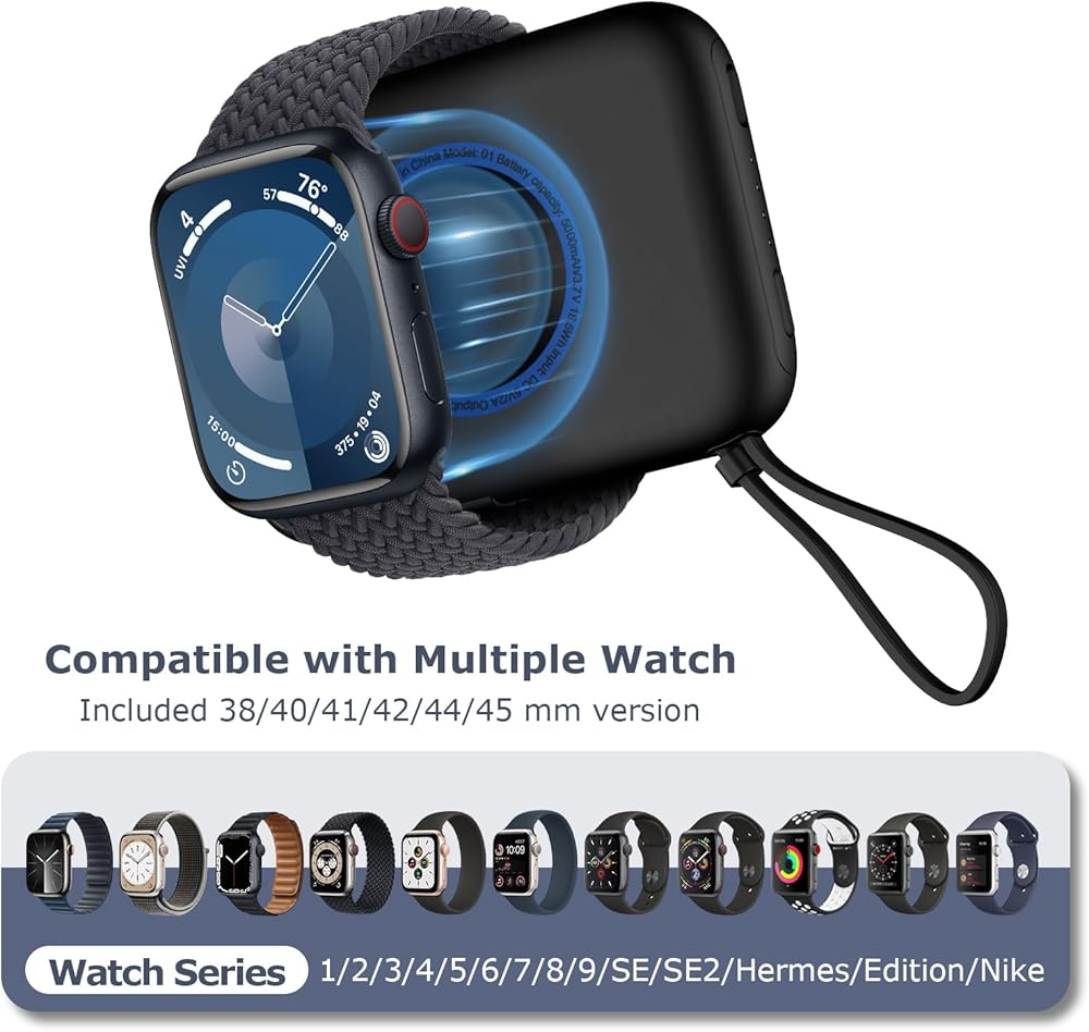 تصميم مدروس: بنك الطاقة خفيف الوزن وصغير بما يكفي ليناسب جيبك أو تعليقه على حقيبتك. يمكن تعديل الكابل إلى حبل وهو مصنوع من مادة PET المتينة. مما يجعل شاحن الساعة هذا أداة مريحة للسفر.