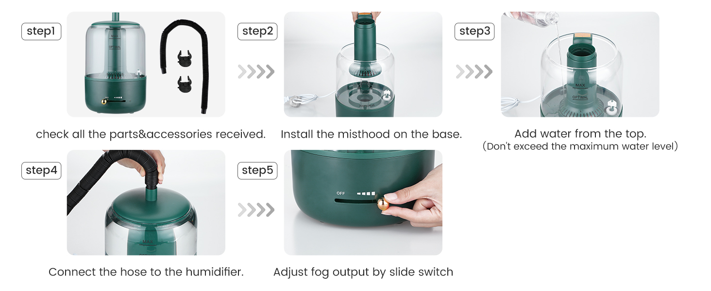 【مخرج ضباب قابل للتعديل】يمكن تعديل كمية الضباب باستخدام مفتاح منزلق. يمكن أن يصل الحد الأقصى لإخراج الضباب إلى 320 مل/ساعة.