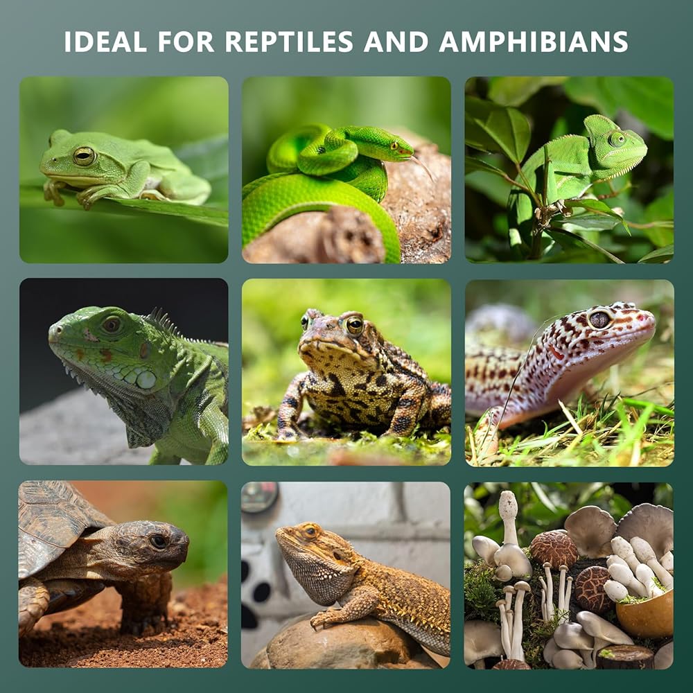 【متعدد الأغراض】مناسب لأي نوع من الزواحف والبرمائيات والأعشاب. سواء كان التنين الملتحي، أو أبو بريص، أو الثعبان، أو السلحفاة، أو السلحفاة، أو الإغوانا، أو السحلية، أو الحرباء، أو الضفدع، أو الضفدع، أو السلطعون الناسك. متوافق أيضًا مع مجموعة متنوعة من العبوات بما في ذلك الأحواض والخزانات والأقفاص ومرابي حيوانات وأحواض السمك والمزيد.