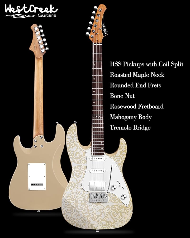 جيتار كهربائي ذو جسم صلب من WestCreek JX-20، التقاطات HSS مع ملف منفصل، رقبة خشب القيقب المحمص، حنق نهاية مستديرة، صواميل عظمية، لوحة فريتس من خشب الورد، جسم الماهوجني (أبيض فيكتوري)