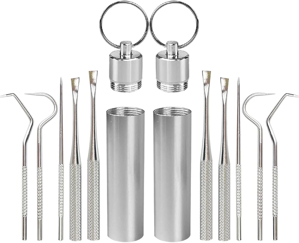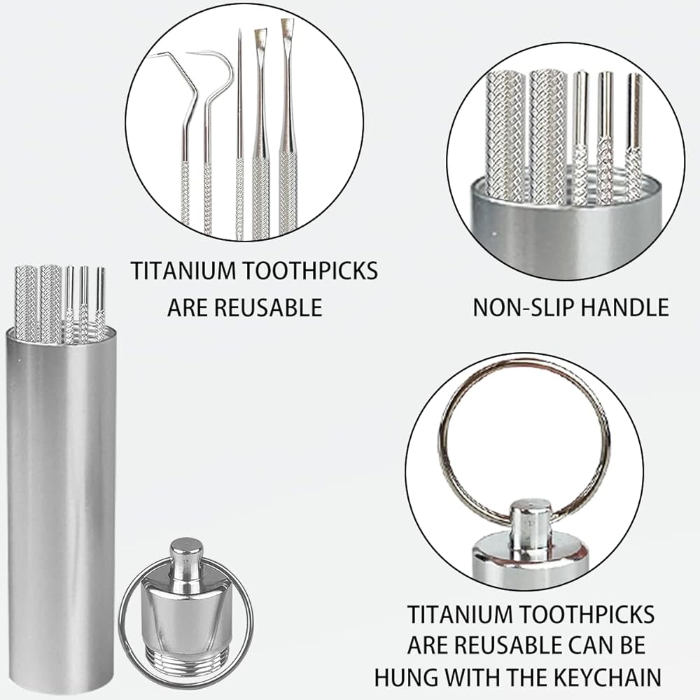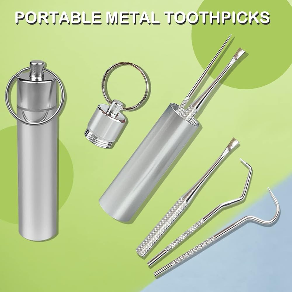 5 قطع 2 مجموعة من أعواد الأسنان المصنوعة من الفولاذ المقاوم للصدأ، أعواد أسنان معدنية محمولة قابلة لإعادة الاستخدام وحامل أعواد أسنان، متعددة الأشكال لإزالة أعواد الأسنان المعدنية، مثالية للنزهات الخارجية والتخييم والسفر