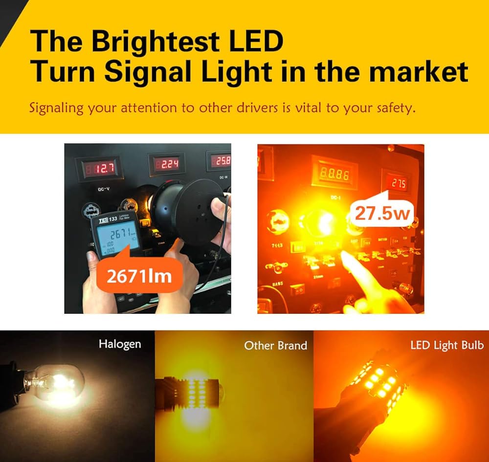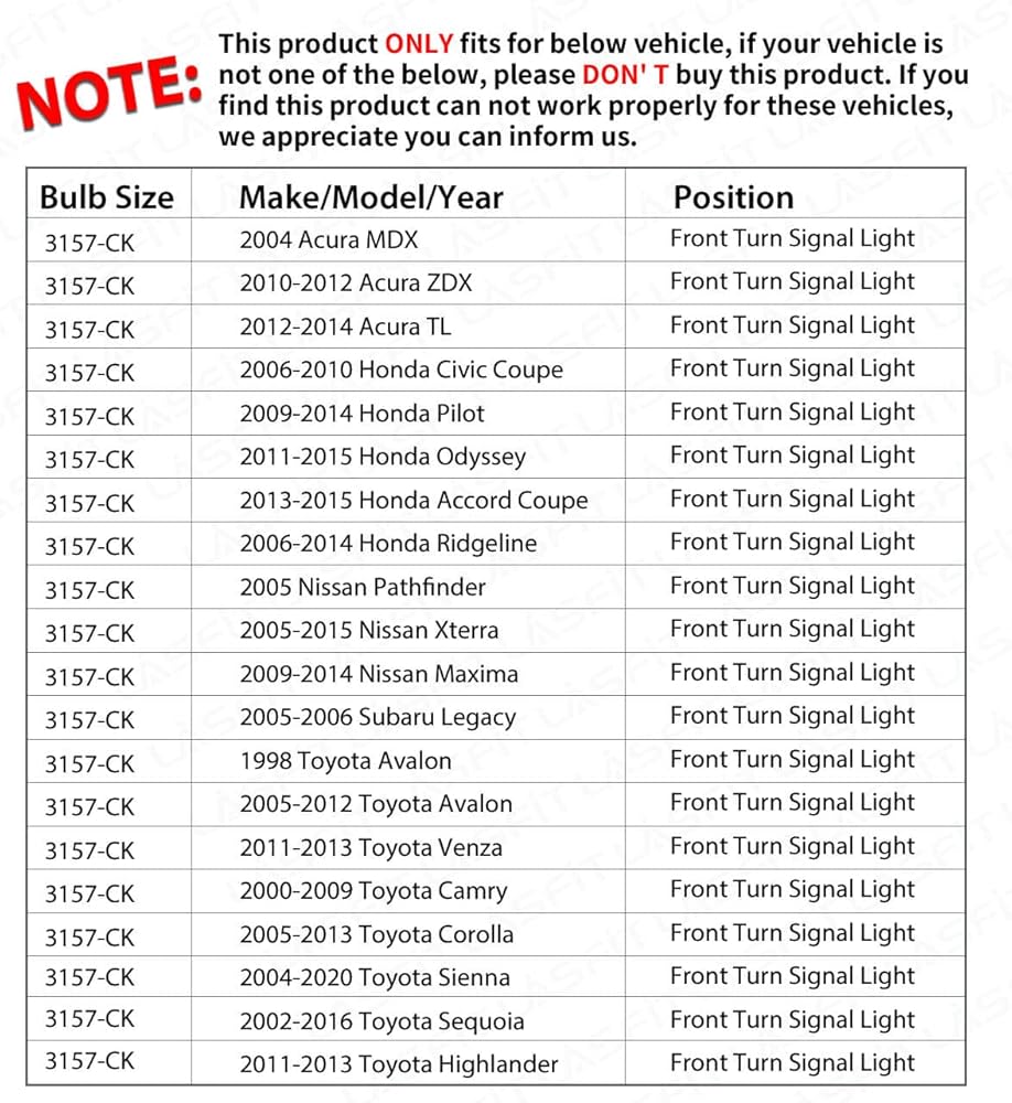 ✦مفتاح مزدوج اللون: يضيء 6000K زينون أبيض لمصابيح وقوف السيارات أو أضواء التشغيل النهارية (DRL)؛ 3000K فلاش كهرماني لمصابيح إشارة الانعطاف أكثر سطوعًا بنسبة 200% من الهالوجين. ملحوظة: هذه المصابيح حساسة للقطبية. إذا لم يضيء مصباح LED بعد إدخاله، فما عليك سوى إزالته وقلب الاتجاه وإعادة تثبيته.