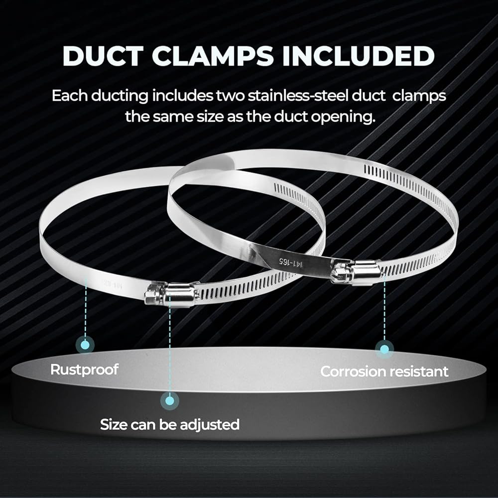 • Note: although the ducting is easy installation, violent installation is prohibited. With 2 pair of 6inch metal clamps made from stainless steel.
