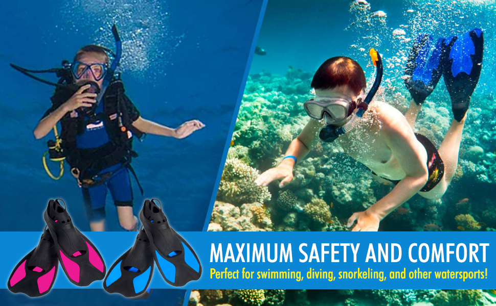 أقصى قدر من الأمان والراحة - إنها رائعة للمبتدئين الذين يتعلمون فقط كيفية استخدام الزعانف أو المحترفين المتمرسين، وتأتي الزعانف بتصميم جيب للقدم لتقويم العظام يوفر أقصى قدر من التحكم والراحة. يساعد السباحين على السباحة بشكل صحيح دون التعرض لشد عضلي. هذه الزعانف خفيفة الوزن للأولاد والبنات خفيفة للغاية ولا تشغل مساحة كبيرة، وسهلة الاستخدام للغاية ولا تؤذي أقدامهم على الإطلاق. مثالية للسباحة والغوص والغطس والرياضات المائية الأخرى!