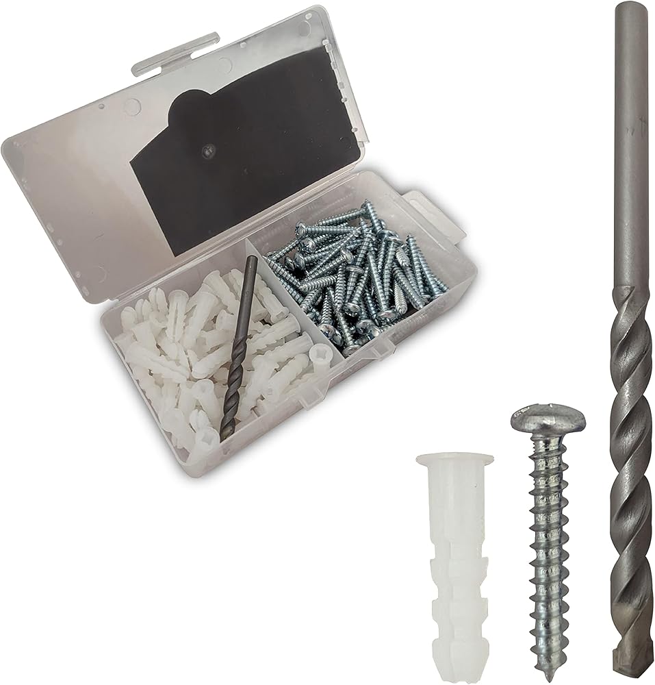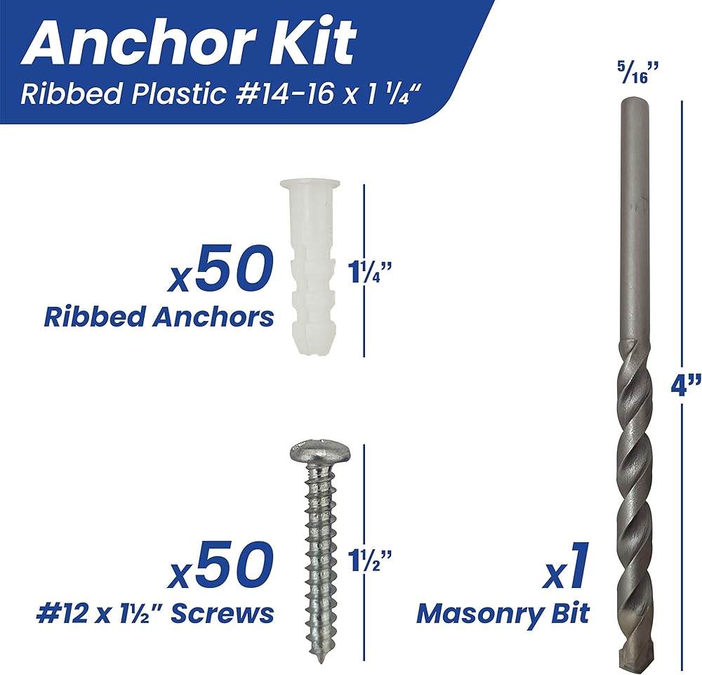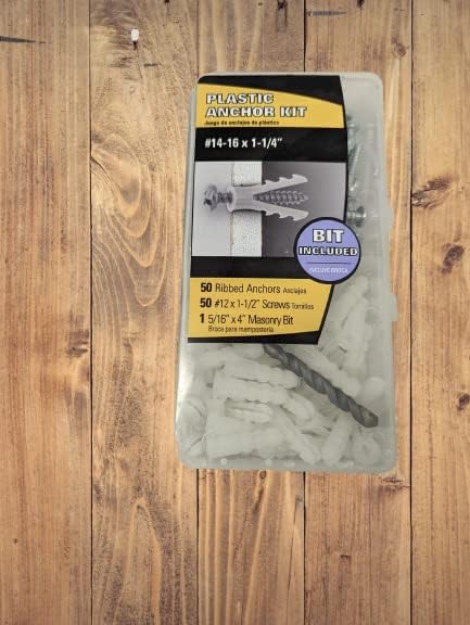 Kit Contents: The package includes 1 drill bits 1/4'' x 4'', 100 of high-quality #10-12 x 1” plastic anchors, 100 #10 x 1-1/4'' Screws Philips head and a clear storage box.