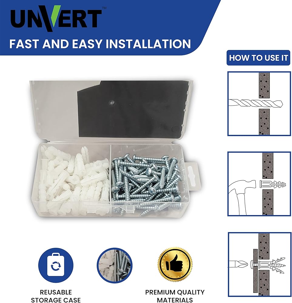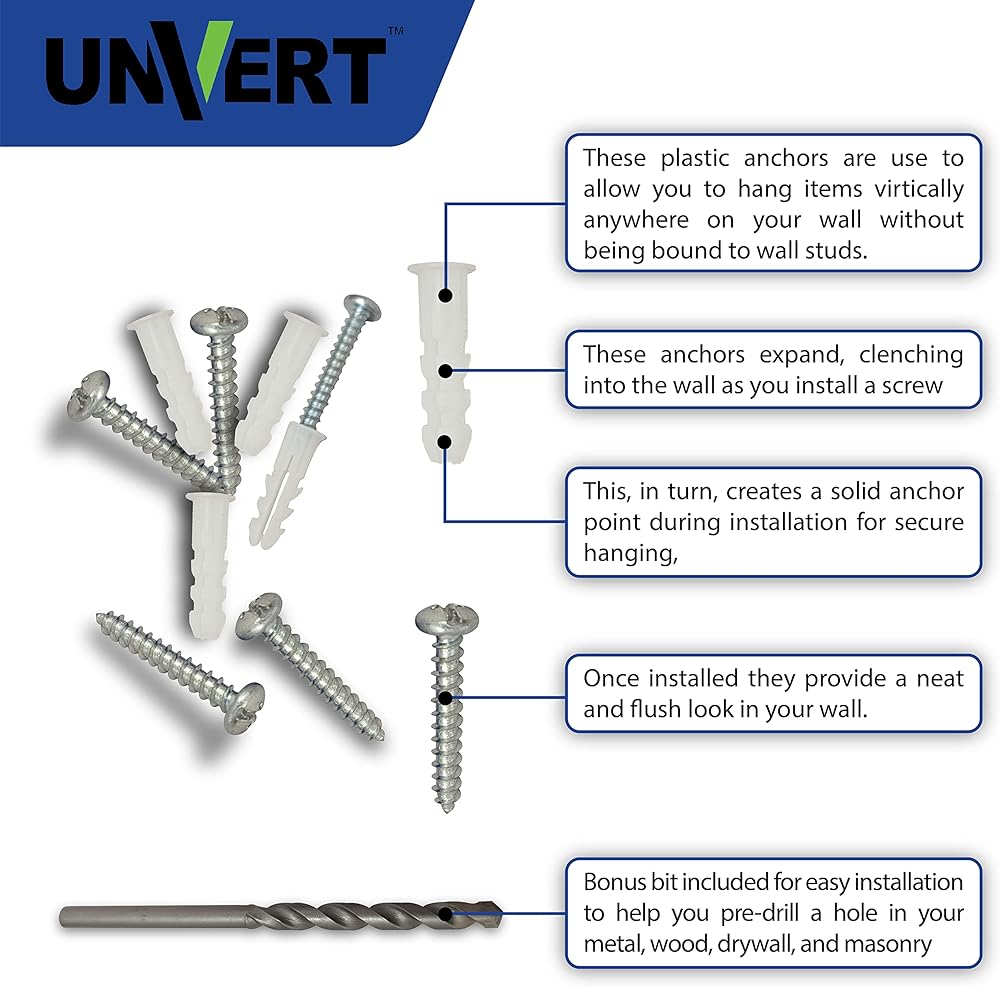 Multi Purpose: Unvert brick wall anchors help you mount items such as doorbells, curtain rails, pictures, mirrors, photo frames and lanterns on brick walls, concrete walls, dry walls, wooden walls, tile, plaster, stucco and more. It is so strong and powerful that it drills directly into drywall even if you hit a wood stud.