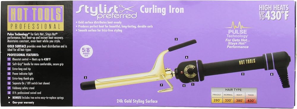 Midi 5/8" Professional Spring Iron with Rubberized Handle Model 1109R 5/8" barrel for smooth, tight curls. Hot Tools ' Patented Pulse Auto Heat Control senses heat loss and regenerates heat instantly for nonstop curling with consistent quality. Four times the power of standard curling irons. Professional Features Include: 10 variable heat settings Powerful spring clamp Extra-high heat 24K gold-plated barrel Fast heat up Heavy-duty long life heating element Foldaway safety stand Pilot light Extra-long cool tip Sure-grip comfort handle Built-in rheostat control 8-ft. heavy-duty tangle-proof swivel power cord Solid state circuitry One-year warranty