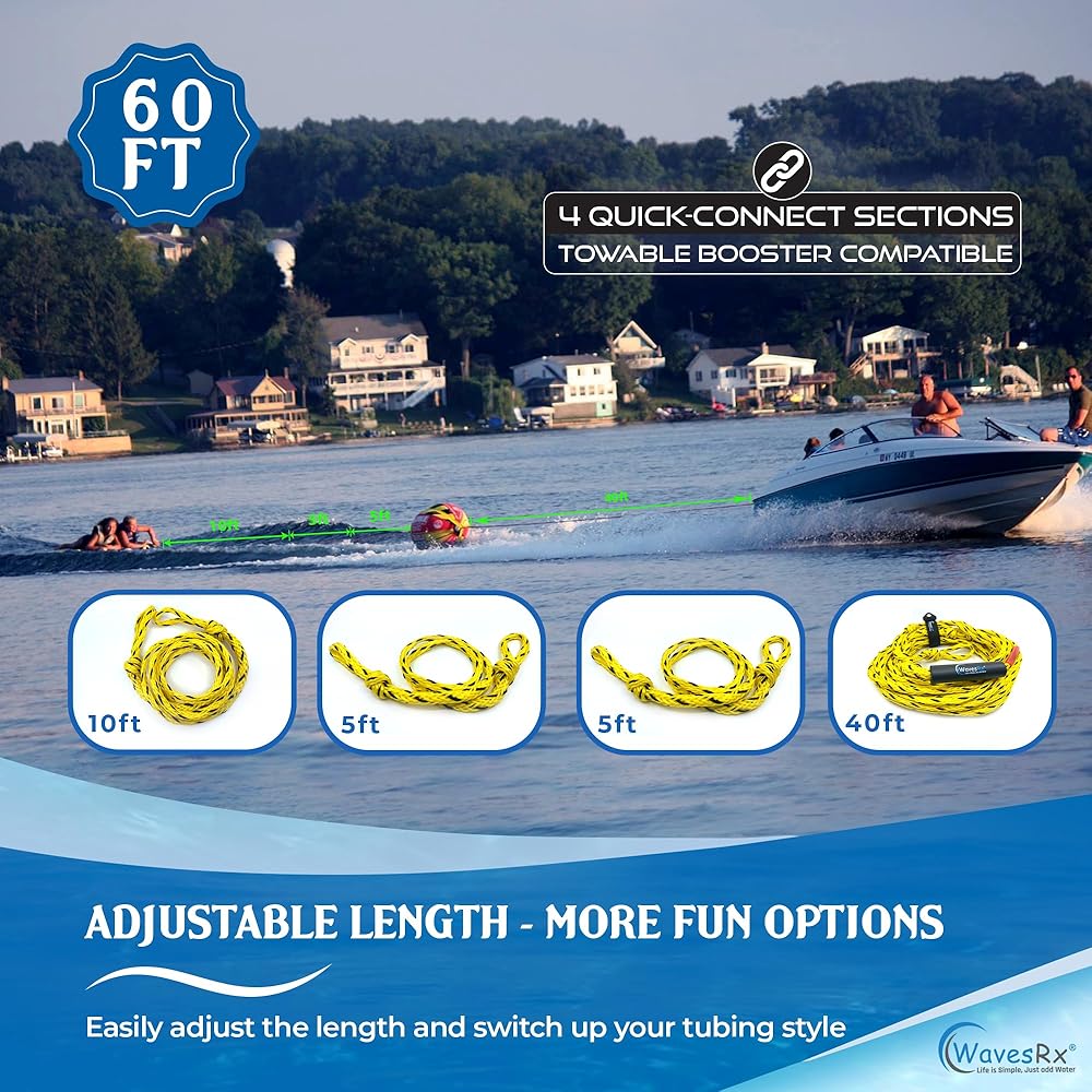 حبل سحب لأنابيب الرياضات المائية من WavesRx للقوارب والتزلج على الماء - طول قابل للتعديل (4 أقسام) وحبال للقوارب والتزلج على الماء لسحب أنابيب المياه والقطرات | حبل سحب لأنابيب المياه المتوافقة مع كرة معززة