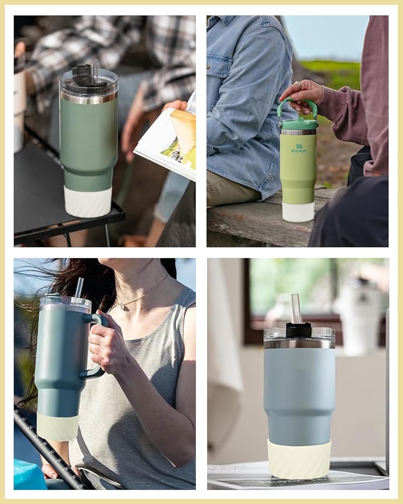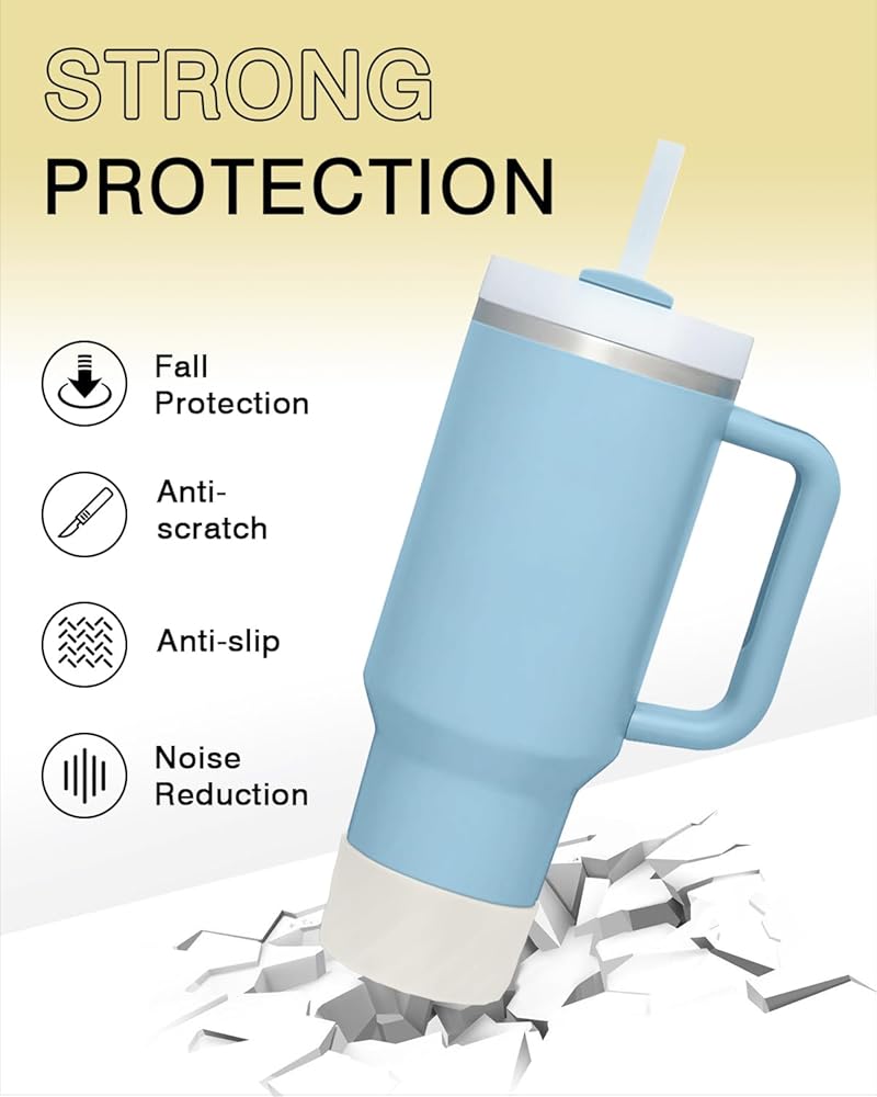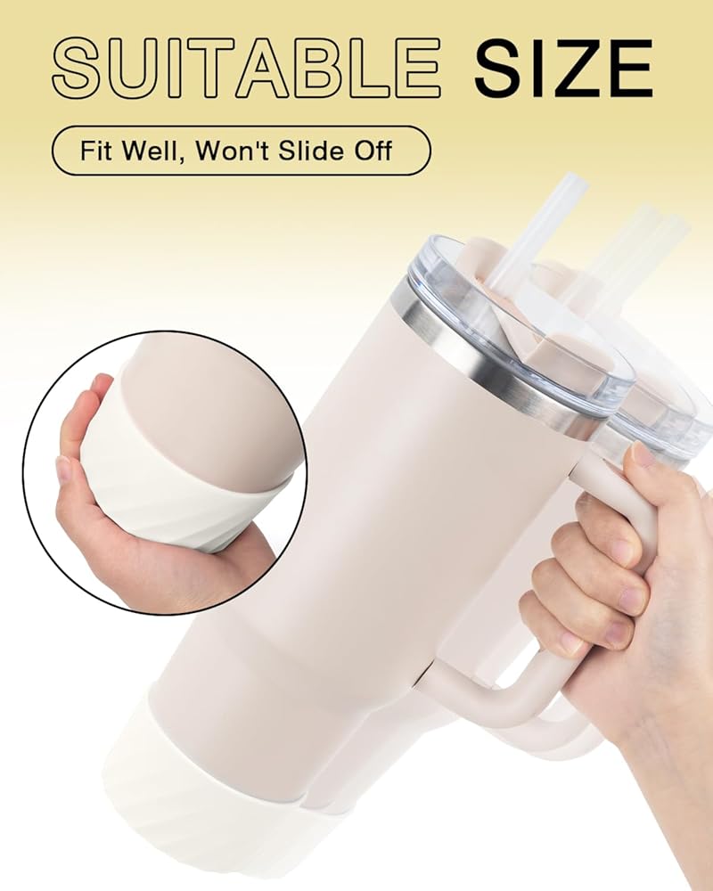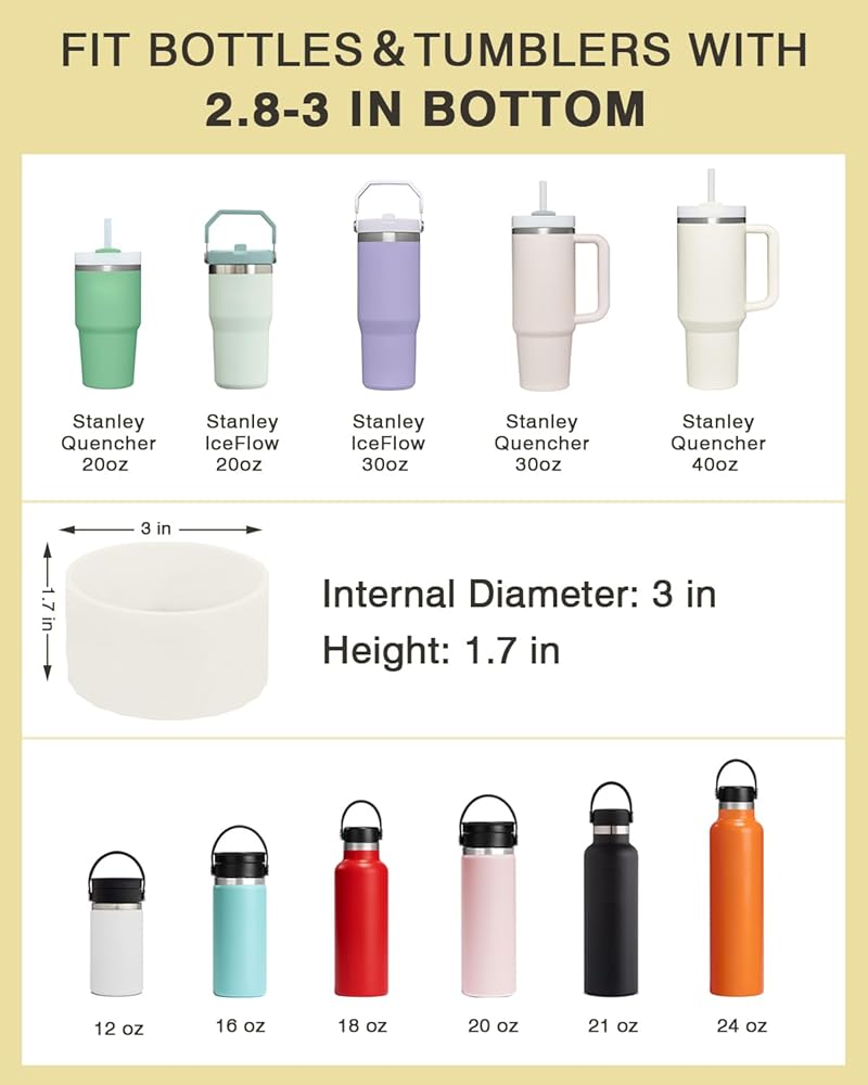 تطبيق واسع: مع القطر الداخلي 3 بوصات، يناسب حذاء السيليكون الخاص بنا Stanley Quencher Adventure H2.0 40oz، 30oz، 20oz Tumbler مع مقبض، Stanley IceFlow Flip 30oz، 20oz، Hydro Flask 12-24oz، Yeti Rambler 12oz، 18oz، 20oz ، Yeti Rambler Jr. 12oz، Simple Modern 24oz، 30oz، 40oz مع مقبض، Simple Modern Summit Collection 12oz، 14oz، 18oz، 22oz، BEAST 30oz، 40oz، Drinco 30oz، 40oz بهلوان، وغيرها من الزجاجات/الأكواب التي يبلغ قطرها السفلي 2.8 -3 بوصة