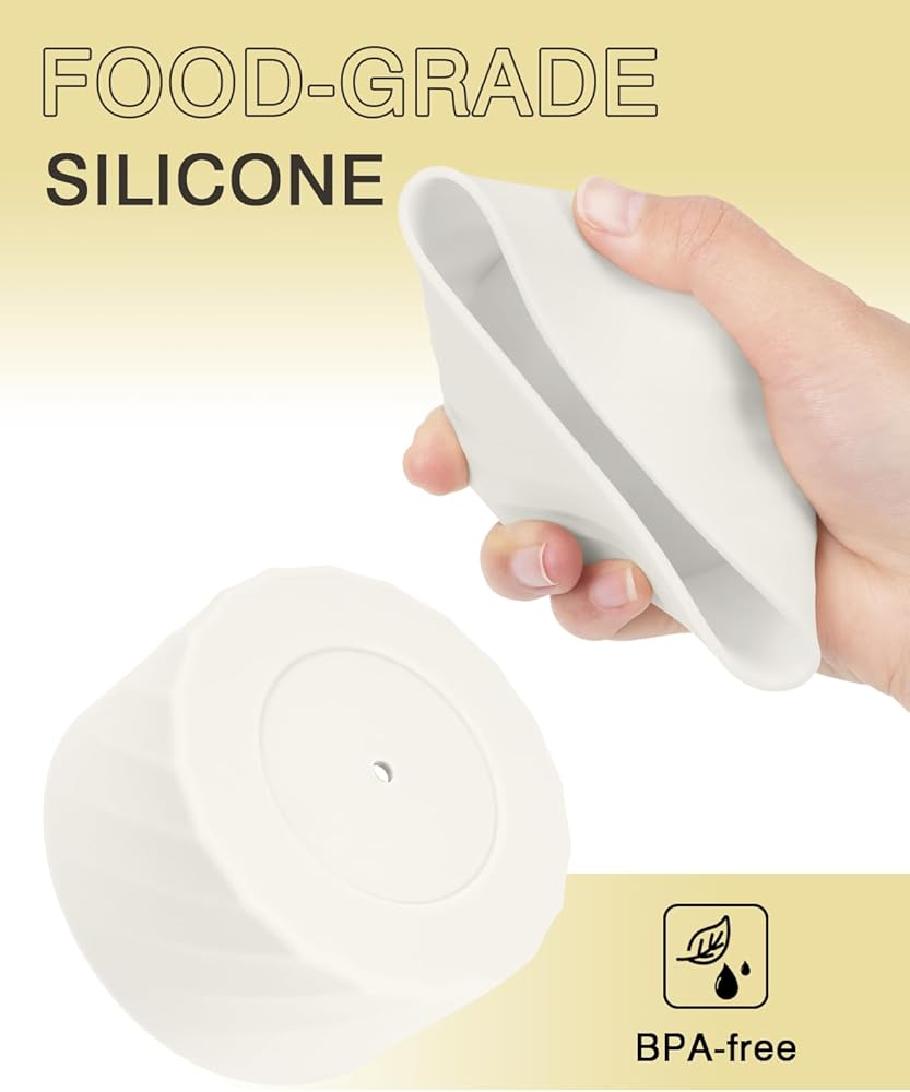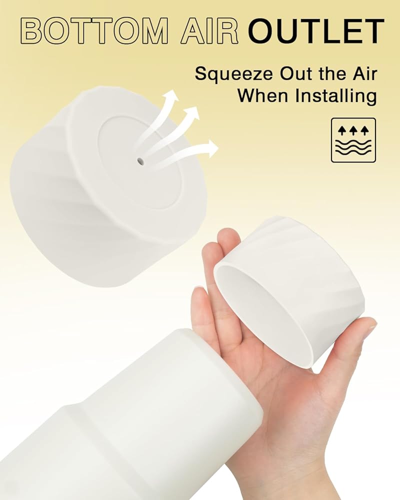 سهل الاستخدام: يوجد فتحة صغيرة في الجزء السفلي من غلاف السيليكون، مما يسهل إطلاق الهواء ويجعل من السهل الانزلاق على الكوب. والغطاء السفلي سهل التنظيف، مما يسمح بالمسح أو الشطف