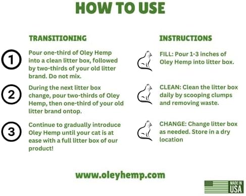 • 🐈 INNOVATIVE CLUMPING FORMULA: Elevate your cat's litter experience with our cutting-edge clumping formula, ensuring hassle-free maintenance and a consistently cleaner living space. Simply pour 2-3 inches of Oley Hemp Cat Litter into your cat's clean litter box for optimal performance.