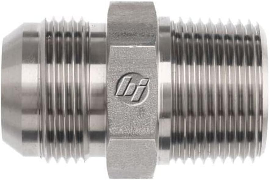 The Brennan 2404 series MJ-MP adapter fitting is made of steel and has JIC male and NPTF male connectors. This adapter fitting connects pipes or fittings with different end types, diameters, or materials. It has a Joint Industrial Council (JIC) flared male connector on one end and a National Pipe Taper Fuel (NPTF) male connector on the other. The fitting is made of steel for its better weldability and increased rust resistance over iron. The working pressure for this fitting is up to 5000 pounds per square inch (psi), and its operating temperature ranges from -63 to 400 degrees F. This tube fitting meets Society of Automotive Engineers (SAE) standard J514 for quality assurance.