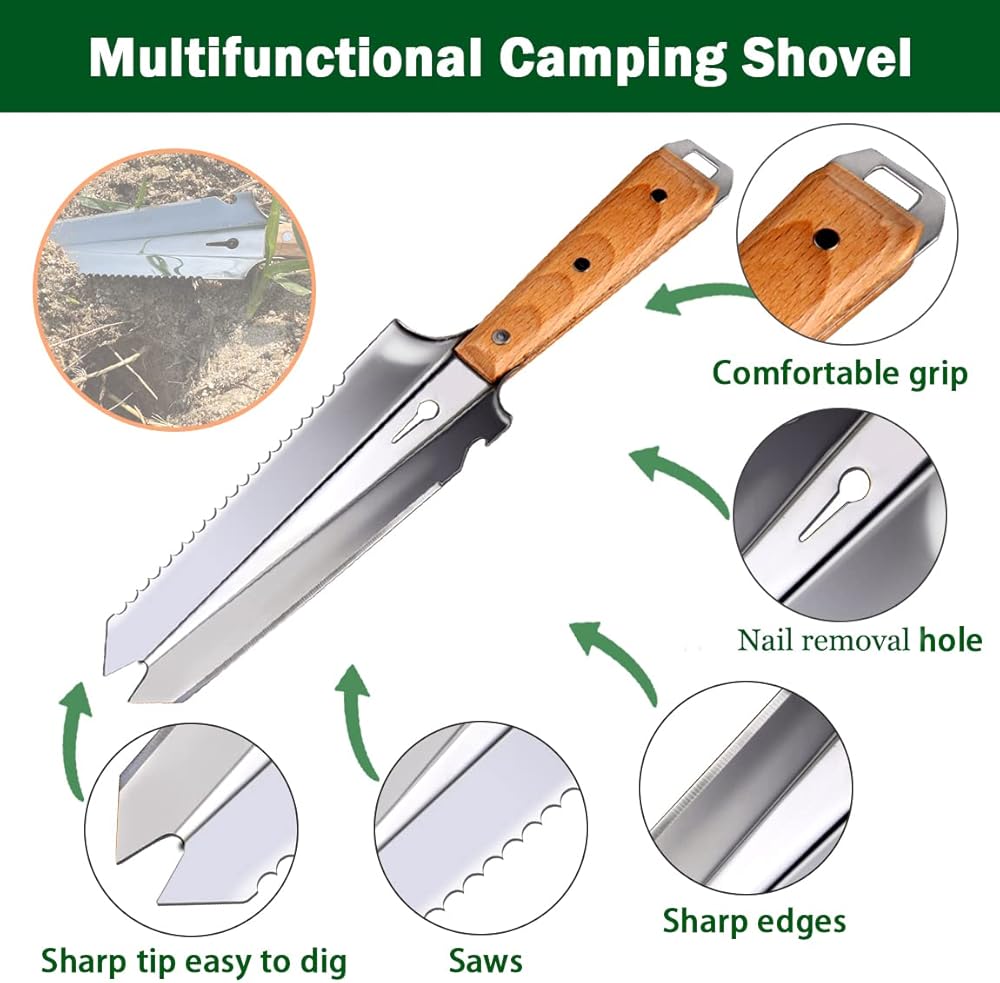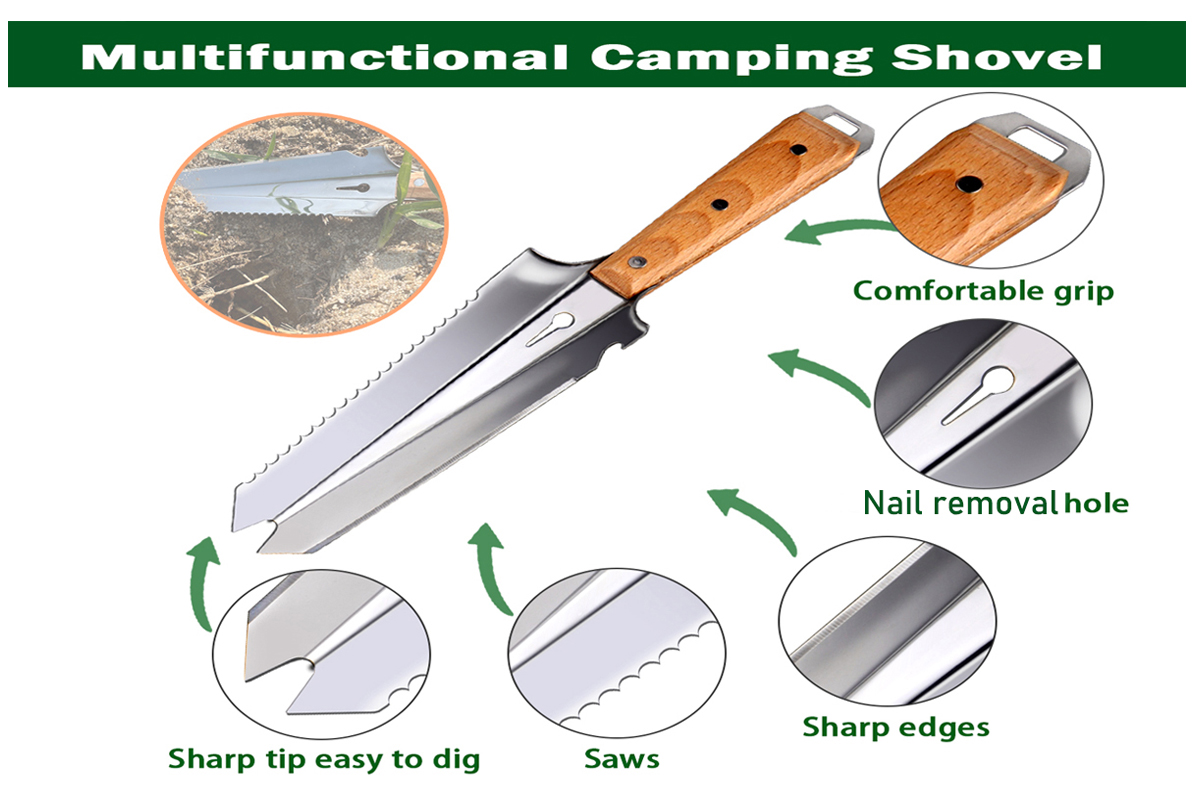 • 【مجرفة تخييم متعددة الوظائف】: تم دمج العديد من الأدوات الخارجية المفيدة في تصميم مجرفة التخييم المصنوعة من الفولاذ المقاوم للصدأ، بما في ذلك المناشير ومزيلات الأظافر والحواف الحادة. يمكن استبدال الأداة بأكملها بأوتاد خيمة أو حتى دفنها في الأرض كجهاز ربط للمأوى. يمكنك التأكد من أنك مستعد لأي شيء!