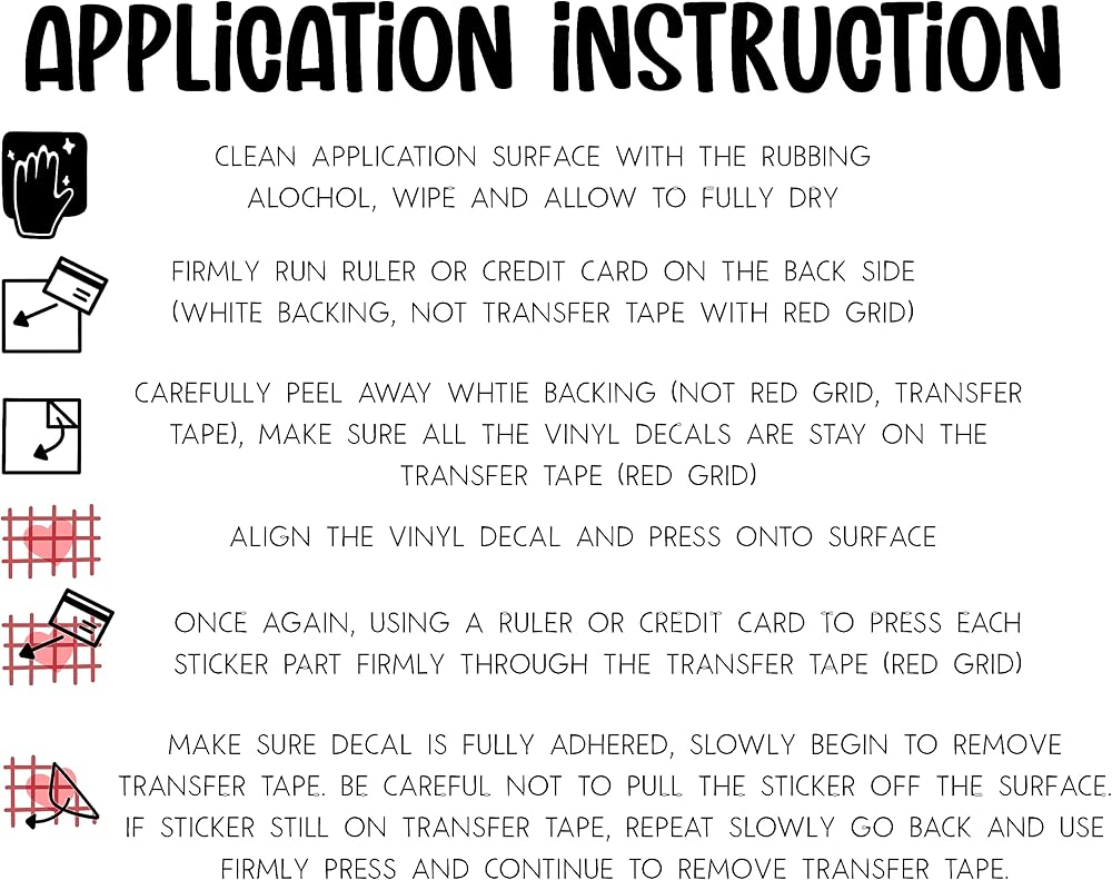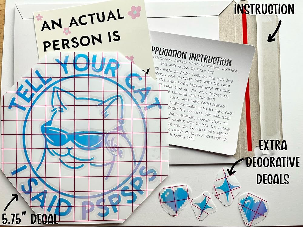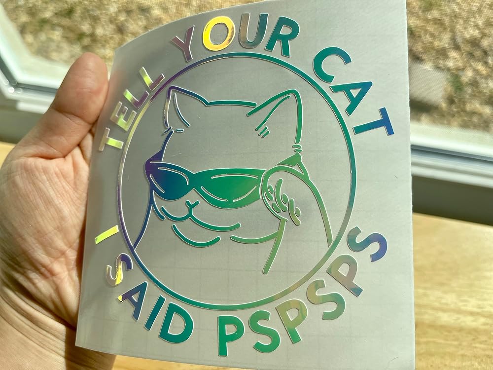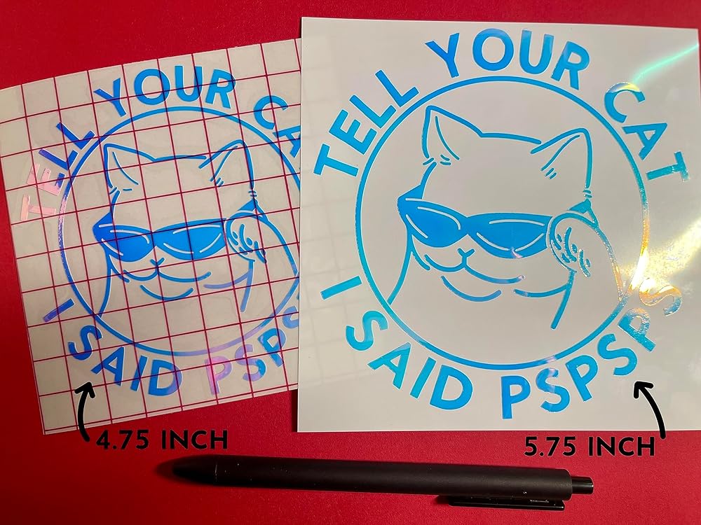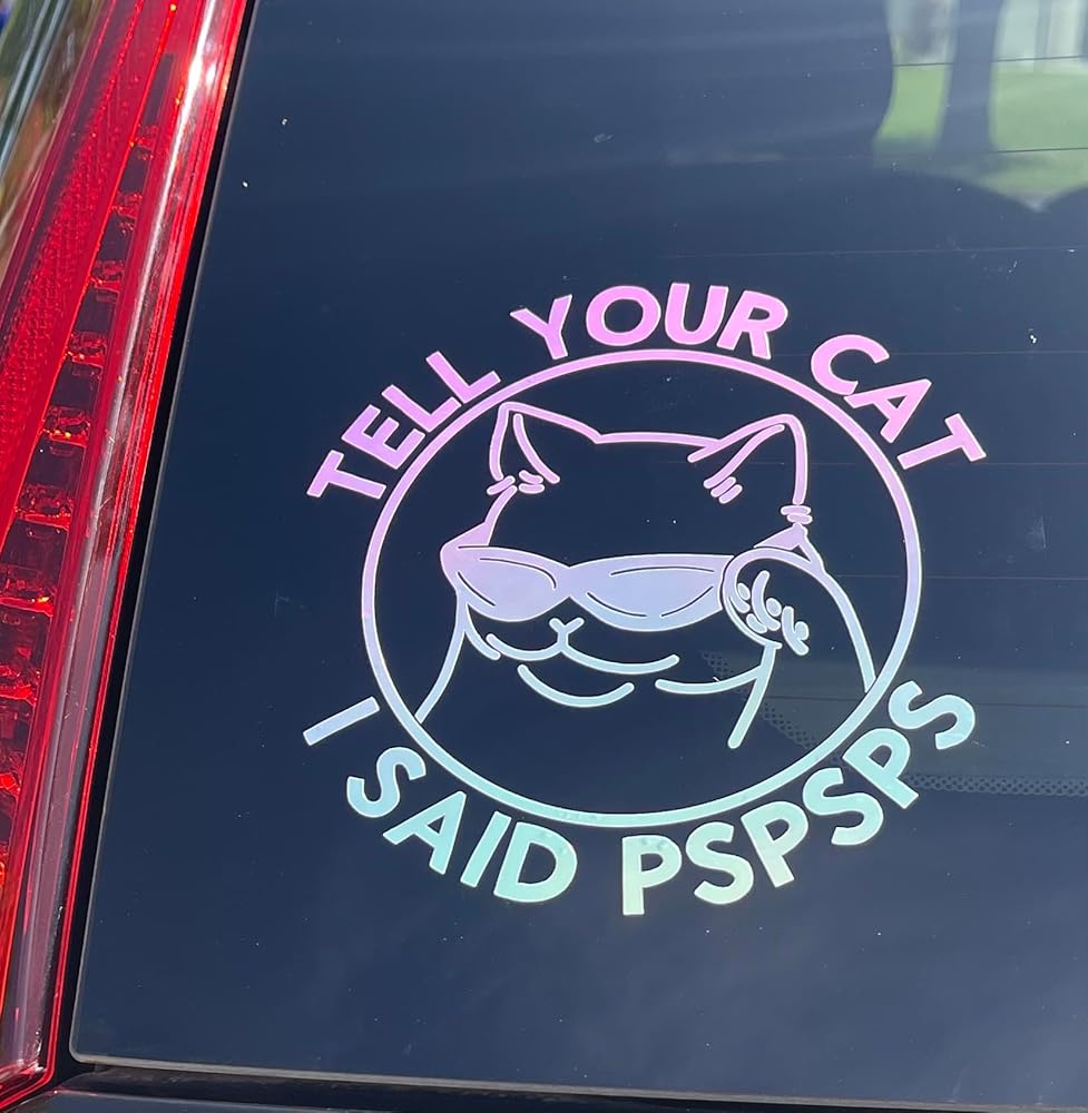 *Main, first picture displayed on black car is 5.75 size Tell Your Cat I said PSPSPS Holographic Decal 5.75 Size -Hand Drawn Sunglass Cat says "Tell Your Cat I Said PSPSPS" -Water proof Premium Holographic Opal Vinyl Decal -Smaller size available: 4.75” * As you noticed, second last picture shows vinyl decal with transfer tape (red grid) has bubbles and it's ok to have them, use of transfer tape is literally to transfer vinyl to your desired area. To ensure all secured adhere, 1. Go Slow 2. If small parts are not sticking to transfer tape OR your desired area, don't panic, go back with transfer tape, and use ruler or credit card to give more press.