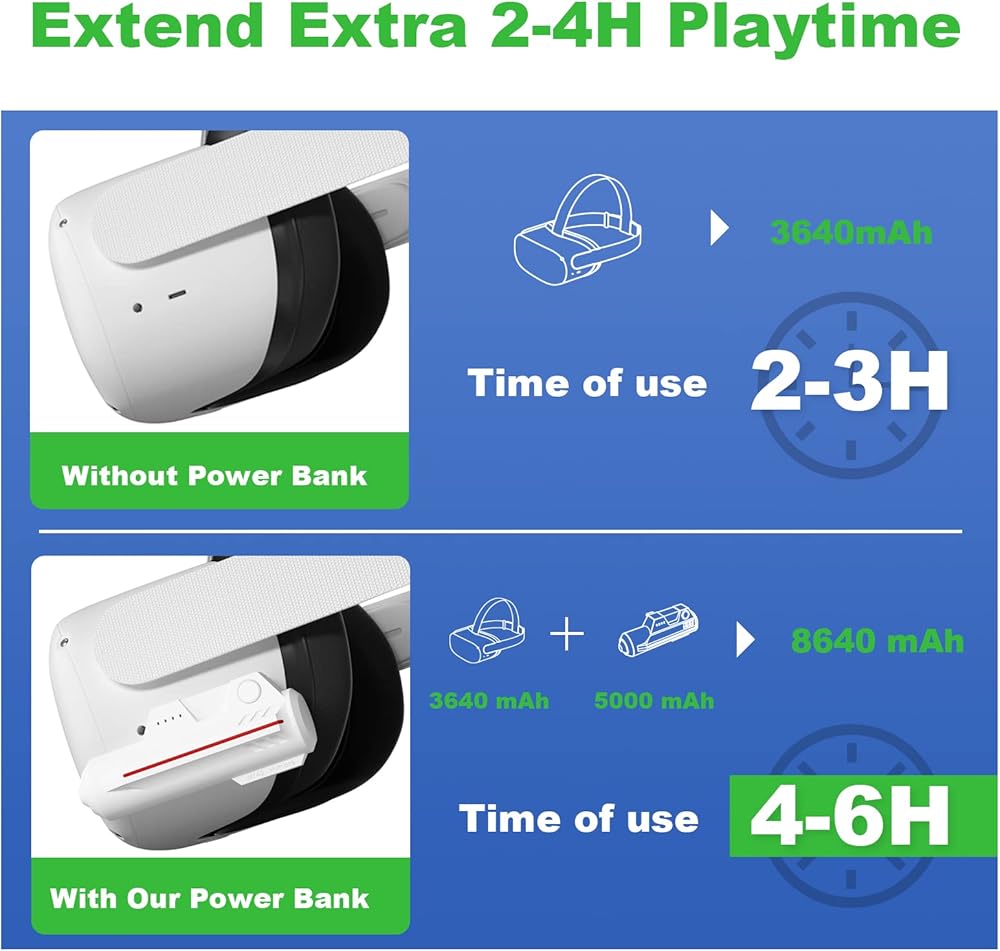 Wide Compatibility: Our high-quality battery pack is compatible with Oculus Quest 2, Elite Strap, and most third-party head straps, as well as devices with Type-C. You can enjoy extended playtime and hassle-free charging