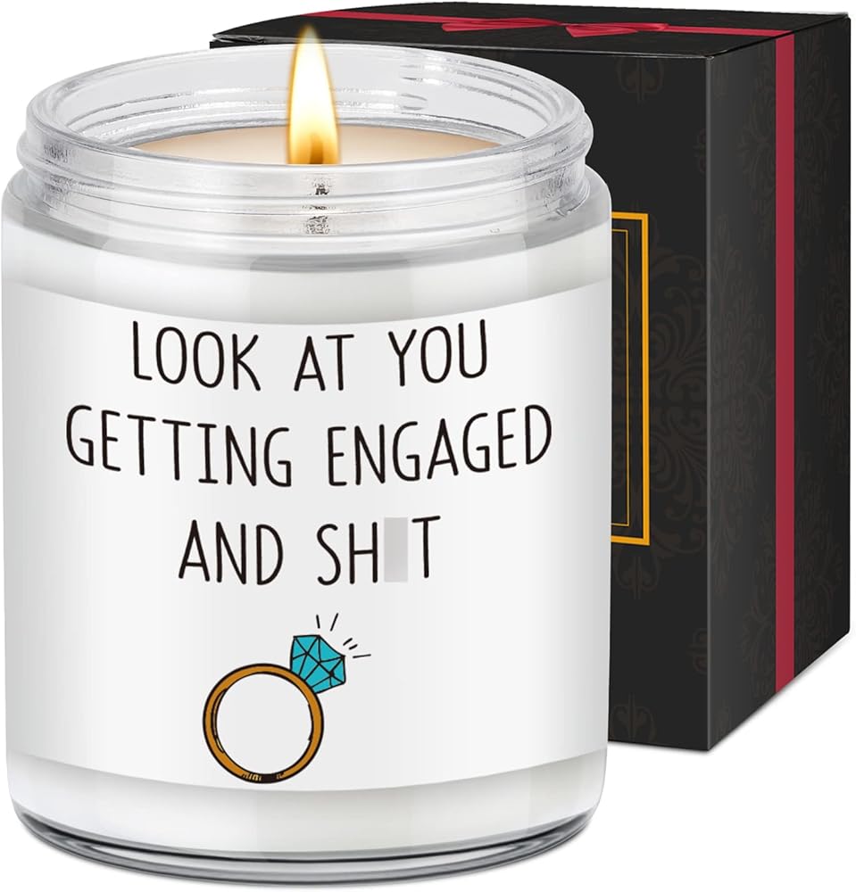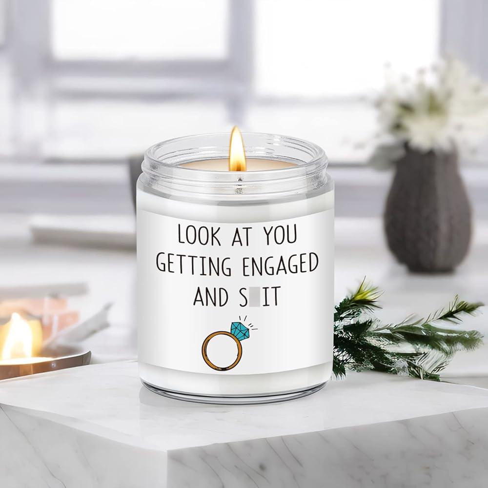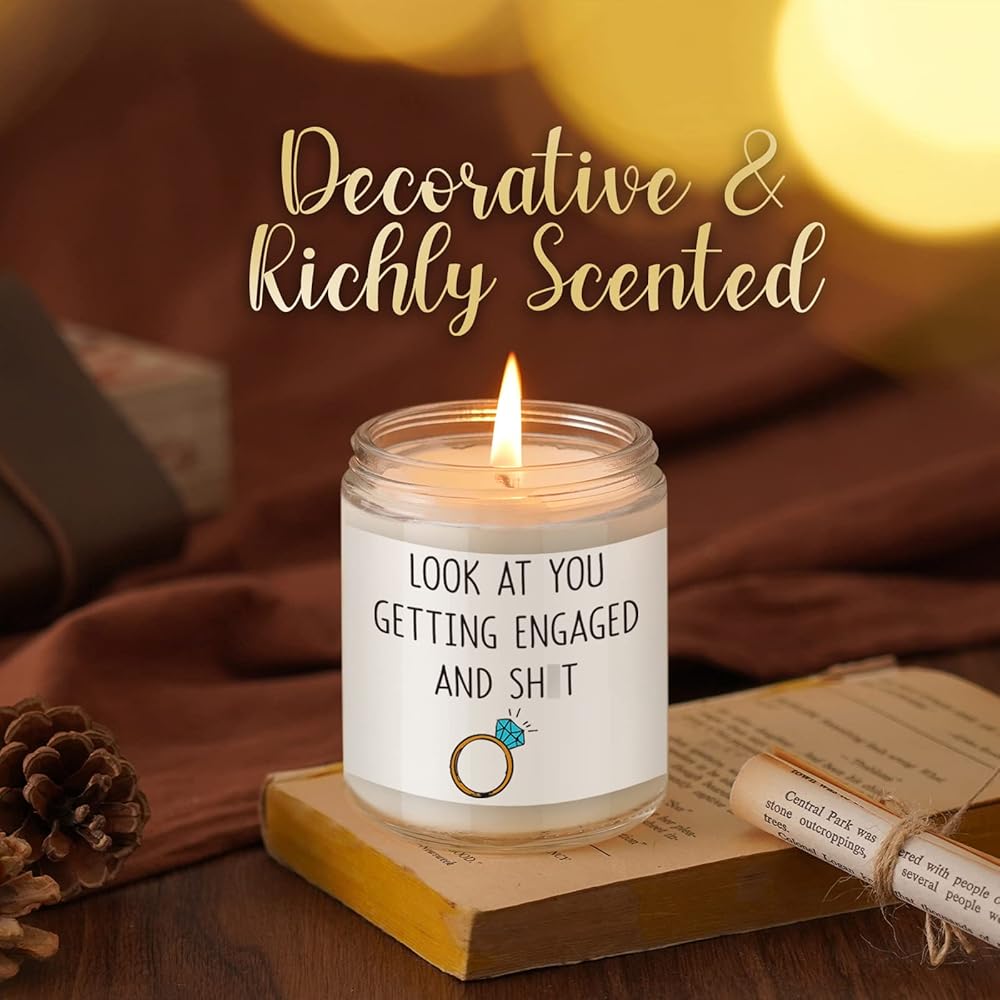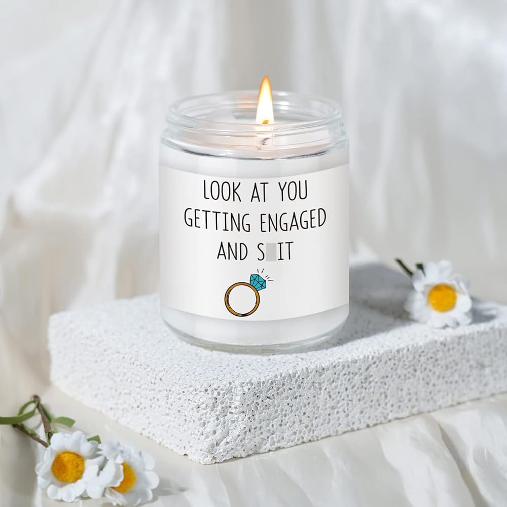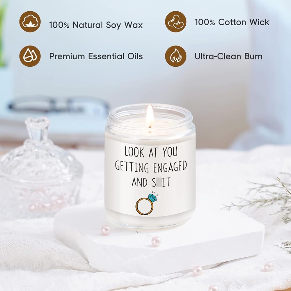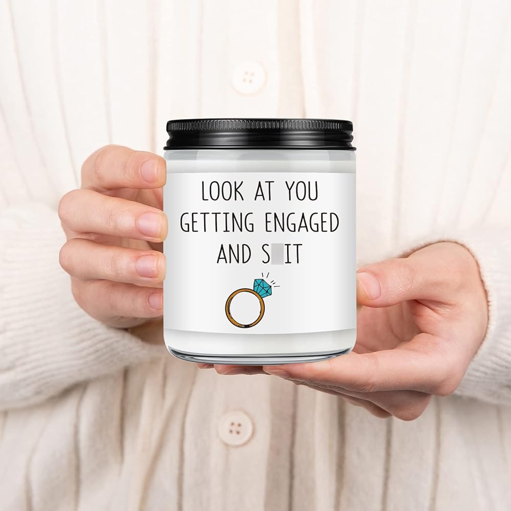 مطبوعة بمقولة "انظر إلى أنك خطبت وS"، تعتبر شمعة الصويا المعطرة هذه هدية خطوبة مفاجئة لها، والعروس، والعروس، والخطيب، والزوجين المخطوبين حديثًا، والصديق المفضل، والصديق المفضل، والزوجة، والصديقة، والابنة. ، زوجة الابن، الحفيدة، الأخت، أخت الزوج، العمة، ابنة الأخ، قريب يتمتع بروح الدعابة أو أي شخص في خضم التخطيط لخطوبتها