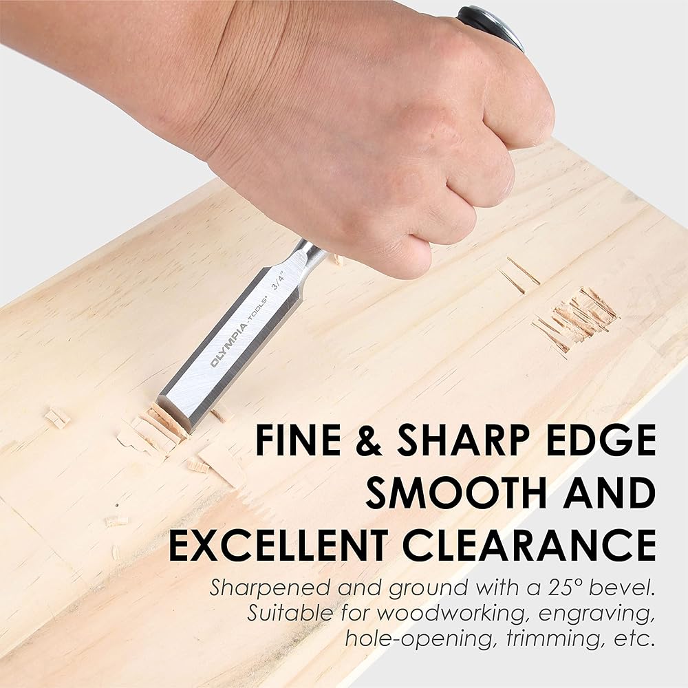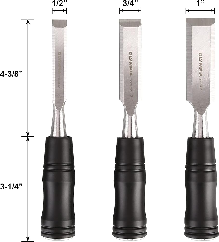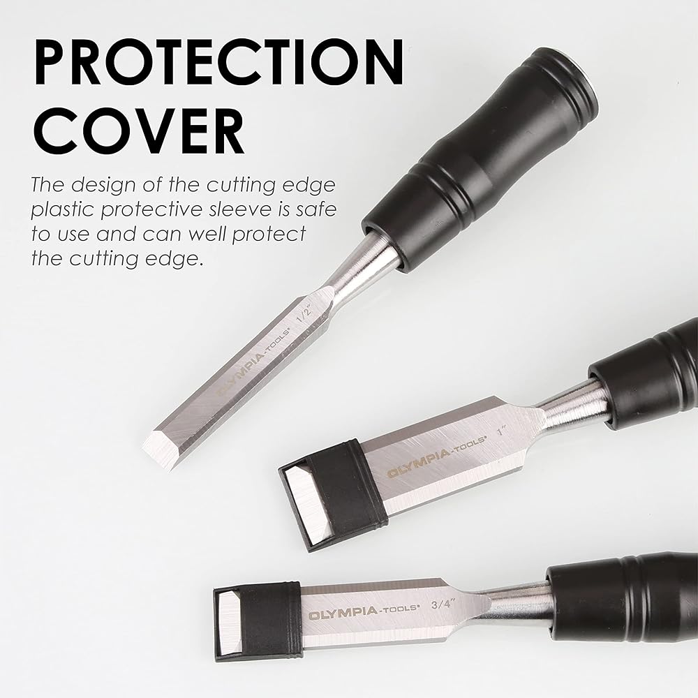 OLYMPIA TOOLS 30-184 4PC WOOD CHISEL LONG PATTERN SET features: Sizes: 1/4", 1/2", 3/4", 1" - Hardened and tempered drop forged alloy steel. - Regular pattern blade. - PVC handle with metal cap. - Edge protector caps.