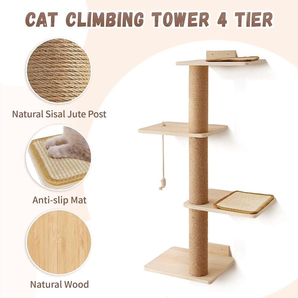 شجرة القطط ذات 4 طبقات عالية الجودة مصنوعة من خشب عالي الجودة وحبل ناعم، والأعمدة المعززة ملفوفة بحبل السيزال الطبيعي. هذا للقطط لخدش وشحذ مخالبها دون الإضرار بالأثاث الخاص بك.