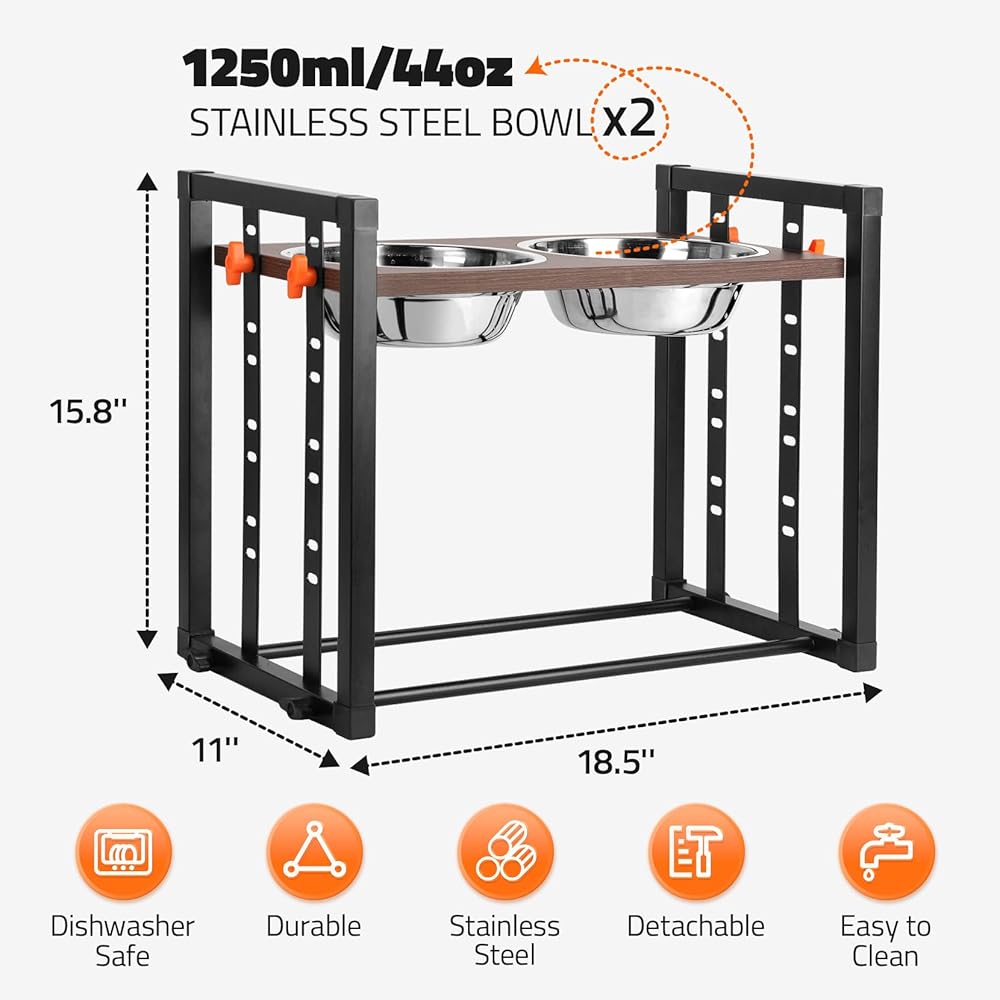 وعاء الكلب المرتفع: حامل وعاء الكلب المرتفع القابل للتعديل بـ 8 ارتفاعات للكلاب المتوسطة والكبيرة جدًا، ومحطة تغذية الحيوانات الأليفة المعدنية المائلة بزاوية 15 درجة مع مجموعة وعاء ماء للطعام من الفولاذ المقاوم للصدأ بحد أقصى 14.5 بوصة ارتفاع