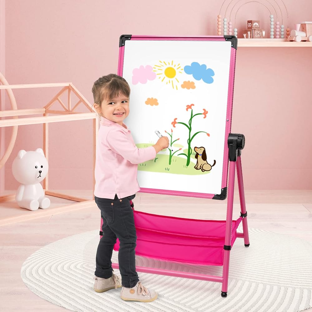【حامل فني متعدد الوظائف】الحامل الفني الخاص بنا مصمم بجانبين ولوحة سوداء وسبورة طباشير. ولا يمكن استخدامها فقط للرسم على السبورة السوداء والسبورة البيضاء ولكن أيضًا للعب الملصقات ولعب الألعاب الأبجدية والأرقام، والتي يمكنها تطوير خيال الأطفال وإبداعهم وتفكيرهم المنطقي! ويمكن أن تسمح لطفلين باستخدامها في وقت واحد لإبداع الرسم، ويمكن للآباء أيضًا المشاركة في لعب الألعاب مع أطفالهم معًا!