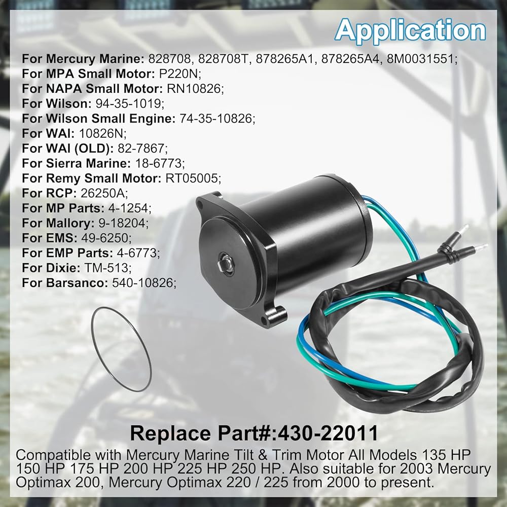Fitment - This 430-22011 Tilt & Trim Motor Replacement for Mercury Marine Tilt & Trim Motor All Models 135 HP 150 HP 175 HP 200 HP 225 HP 250 HP. Also suitable for 2003 Mercury Optimax 200, Mercury Optimax 220 / 225 from 2000 to present. (Replace oem 430-22011)
