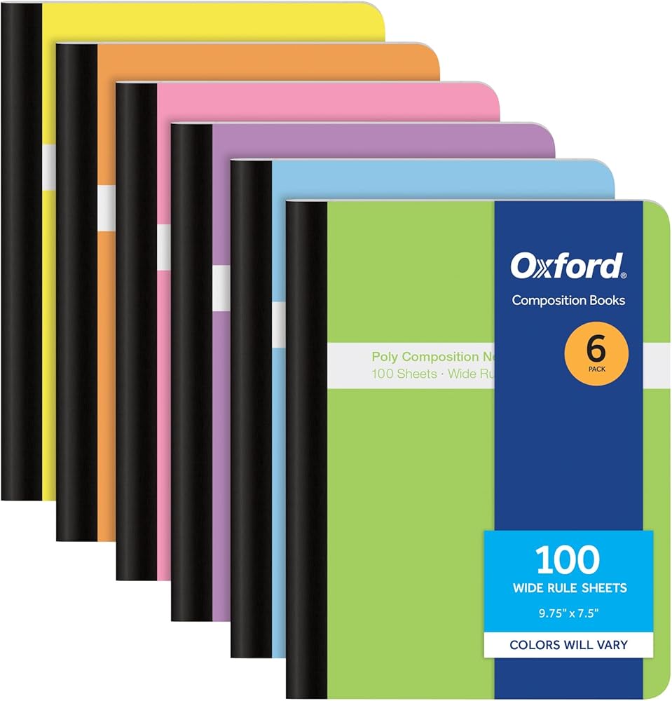 Oxford Poly Composition Notebooks have colorful poly covers to protect your notes against the elements. The perfect comp book upgrade for your toughest notebook user. Moisture and stain resistant covers wipe clean with a sanitizing wipe and are impervious to folding, wrinkling and tearing. These college-ruled notebooks provide skinny lines to fit more creative writing, journaling, note taking or lab work per page than wide ruled paper. Center sewn notebook pages make the composition notebook a teacher favorite. Creates a permanently bound journal, science notebook, bullet journal or writing notebook. Also makes a great homeschool preschool tool for beginning writers. Paper handles ink pens, colored pencils and highlighters for fun writing practice and beautiful notes. 9-3/4" x 7-1/2". College ruled. 100 Sheets. Assorted colors: yellow, orange, pink, purple, blue and green. 6 Per pack.