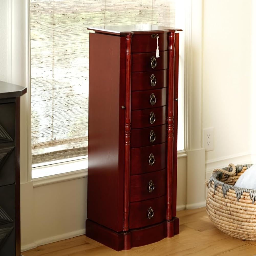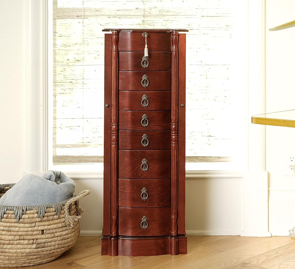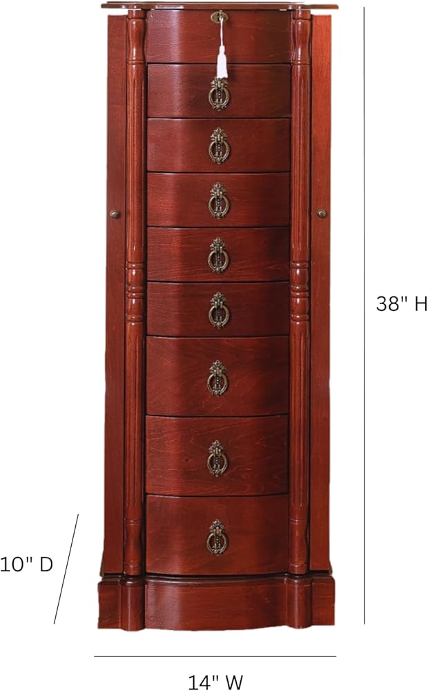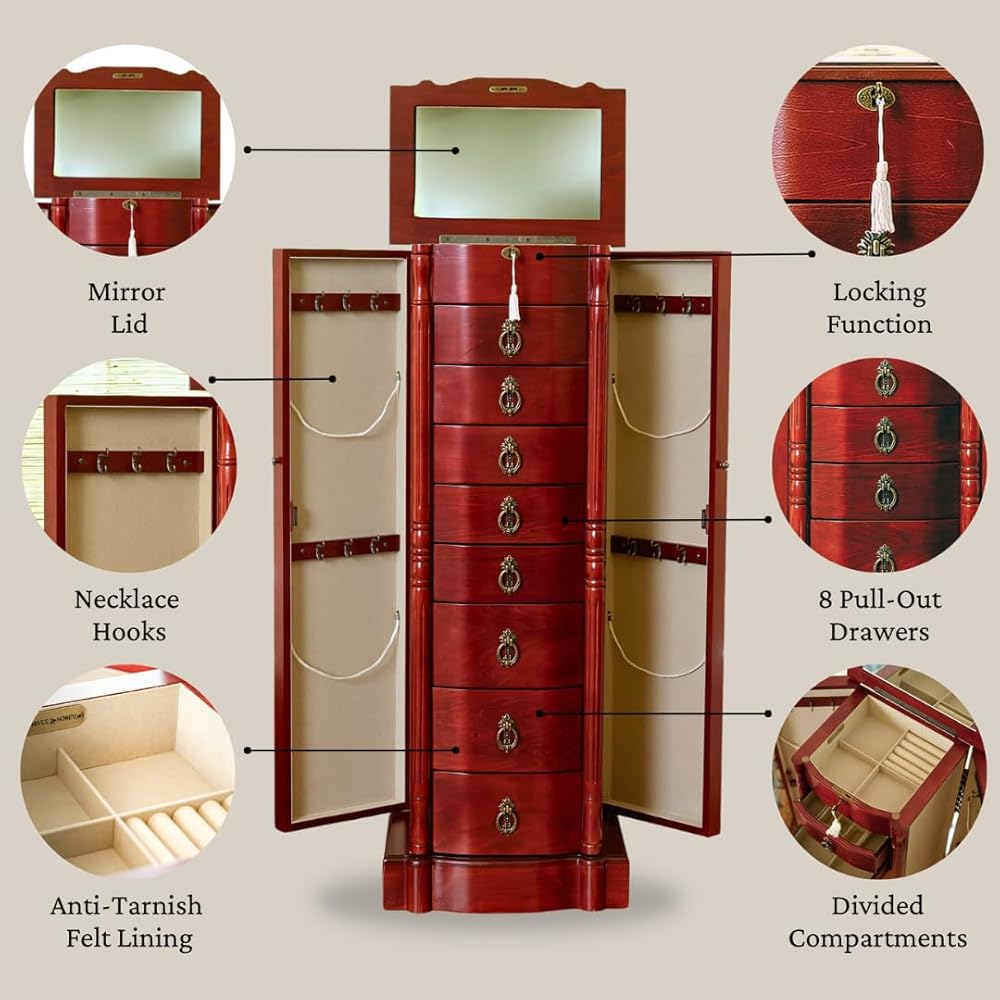 حامل خلايا النحل والعسل روبين، منظم قفل عتيق مع مرآة، 8 أدراج، خطافات قلادة، بطانة مضادة للتشويه، مجمعة بالكامل، خزانة مجوهرات من الخشب الصلب، 91.44 سم ارتفاعًا × 35.56 سم عرضًا × 25.4 سم عمقًا
