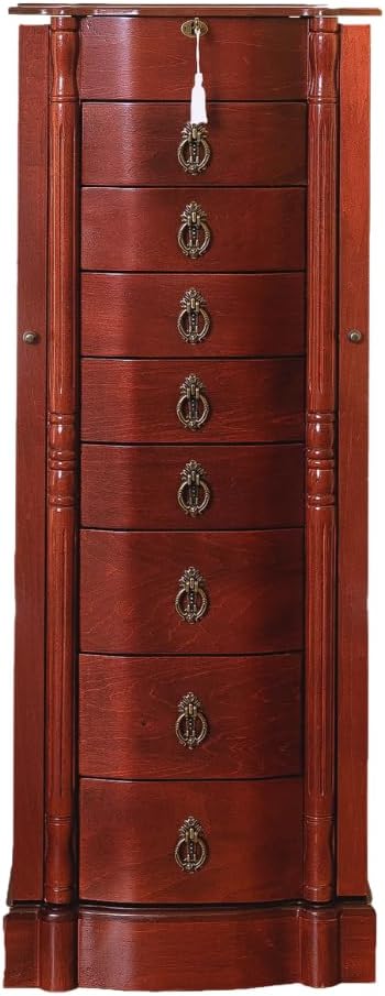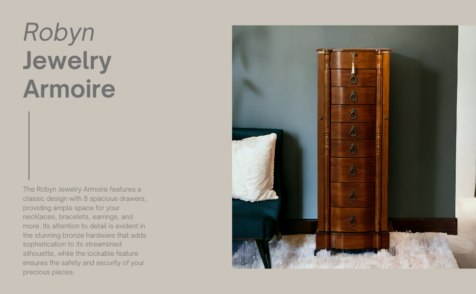Elevate your jewelry collection with the timeless beauty of the Robyn Jewelry Armoire. Boasting a classic design, this armoire features 8 drawers that offer generous space for your necklaces, bracelets, earrings, and more. The top compartment opens to reveal a vanity mirror, ring rolls, and divided compartments for easy access to your everyday essentials. Crafted with attention to detail, the stunning bronze hardware adds a touch of sophistication to its streamlined silhouette. Inspired by Dutch design, the curved front exudes elegance and grace. Plus, the lockable feature ensures that your precious pieces are kept safe and secure. Experience the perfect harmony of style and functionality with the Robyn Jewelry Armoire.