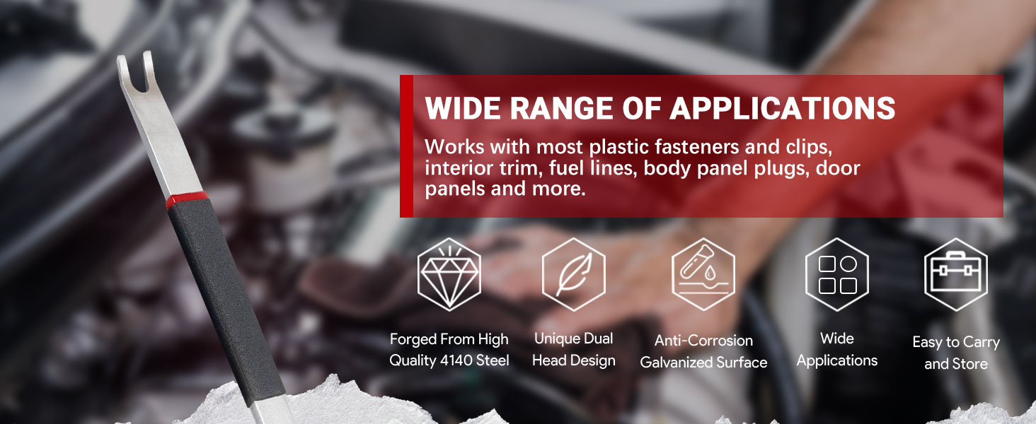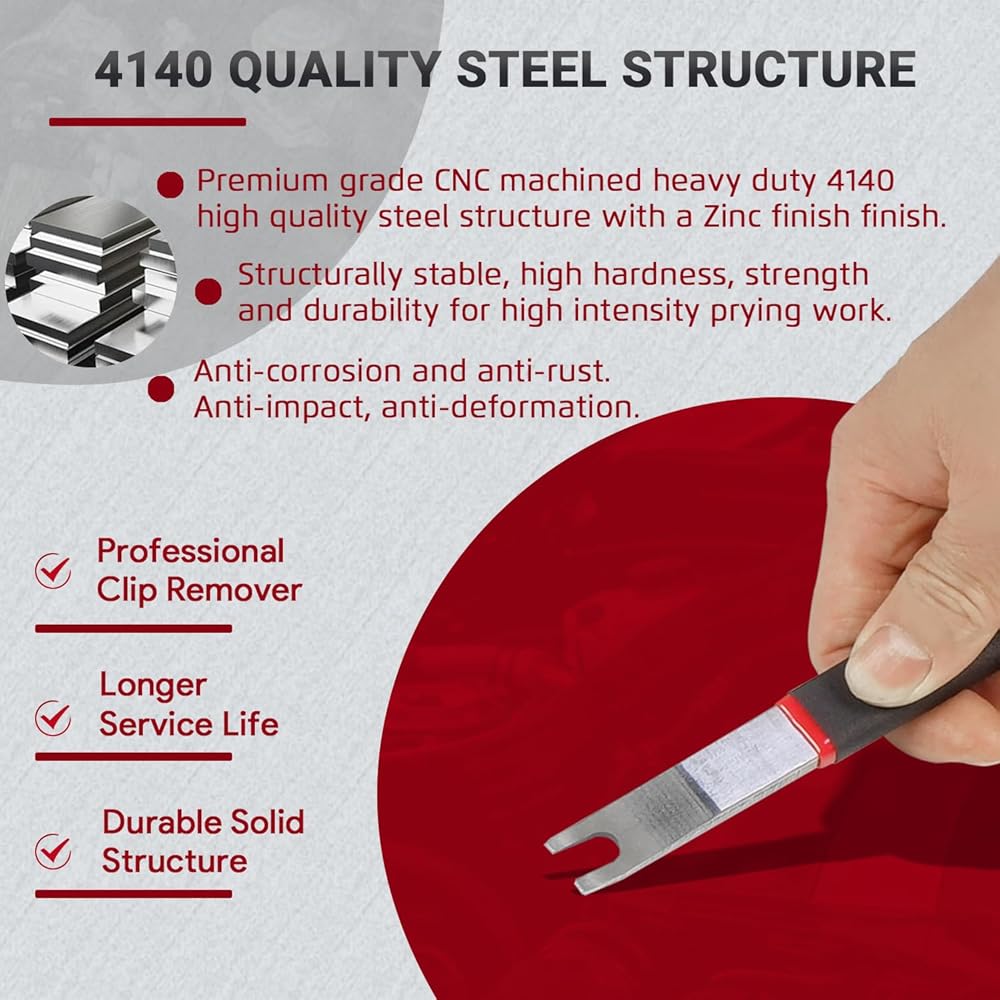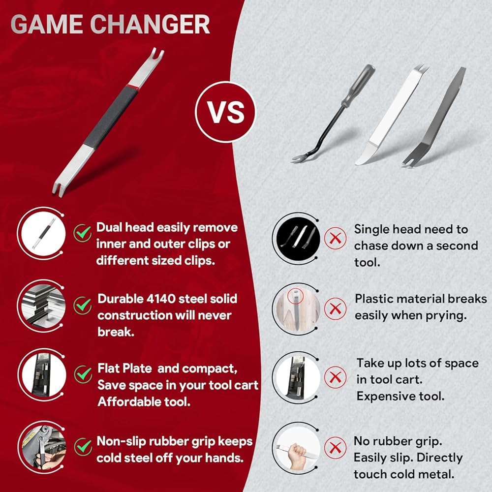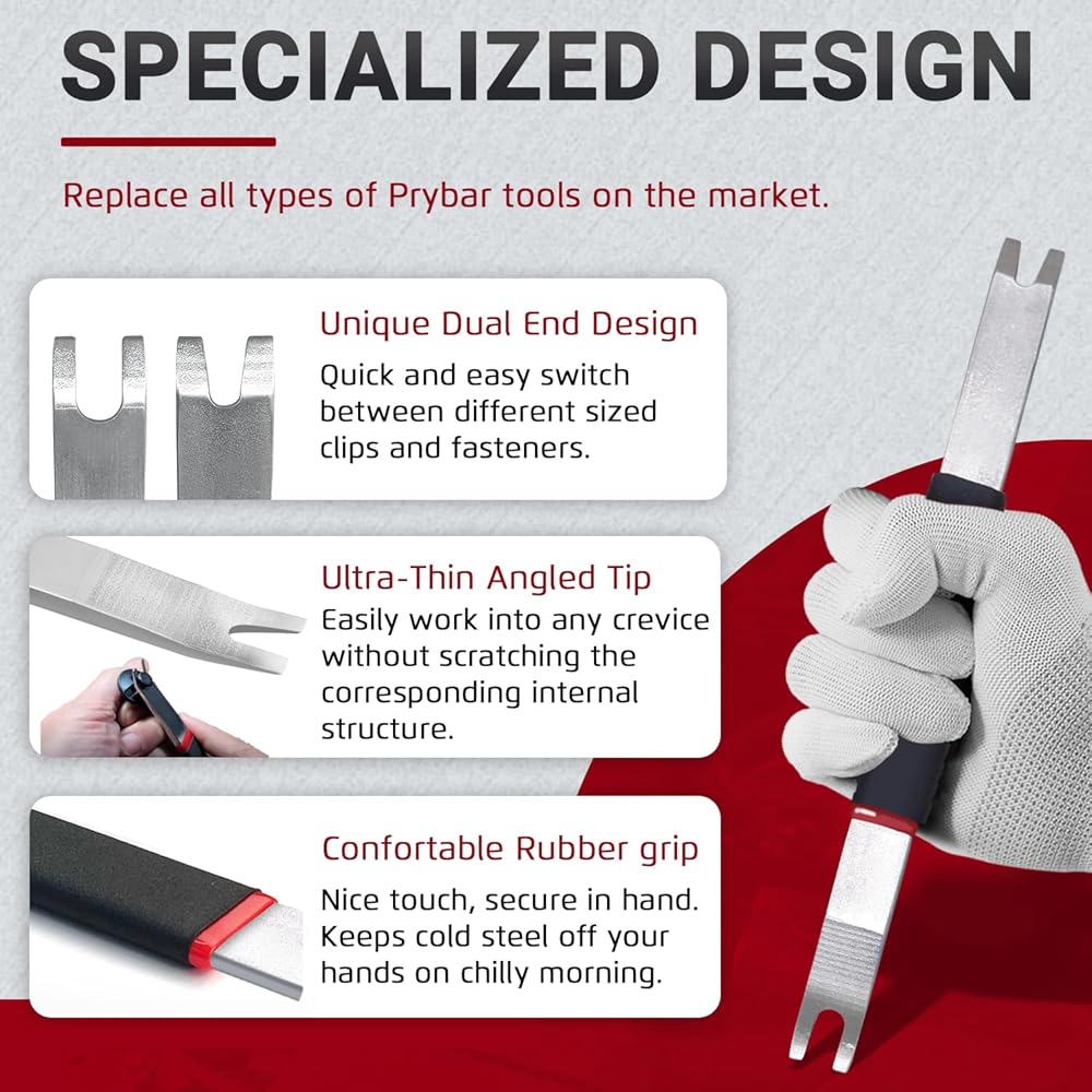 • 【تصميم صناعي متخصص】 تصميم فريد مزدوج الأطراف يسمح بالتبديل السريع والسهل بين المشابك ذات الأحجام المختلفة. يمكن استخدام فتحة أصغر لرفع الدبوس المركزي وفتحة أوسع لرفع المثبت من اللوحة. تصميم دقيق بزاوية رفيعة للغاية مع هيكل متين ومتين يجعل من السهل الانزلاق بين المشابك والألواح. استبدل جميع أنواع أدوات Prybar الموجودة في السوق. التصميم النحيف الجديد يجعل من السهل العمل في أي شق دون خدش الهيكل الداخلي المقابل.