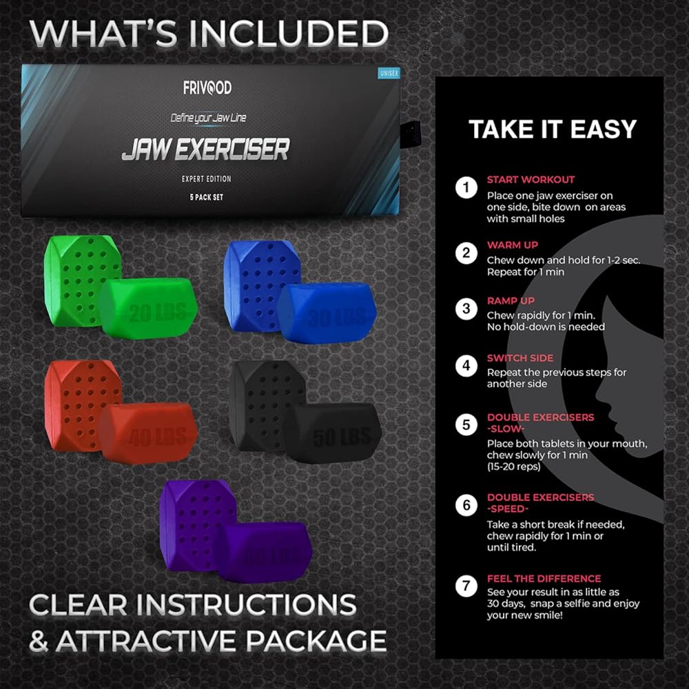 تعليمات واضحة وحزمة جذابة للإهداء: لمساعدتك على تحقيق خط الفك المثالي، يتضمن جهاز تمرين عضلات الفم الجديد دليلاً مفصلاً يحتوي على تعليمات واضحة للحصول على أفضل النتائج الممكنة. تأتي كل مجموعة تمارين عضلات الفم أيضًا في عبوة جميلة تجعلها فكرة هدية جاهزة لأحبائك. عظيم لكل من الرجال والنساء!