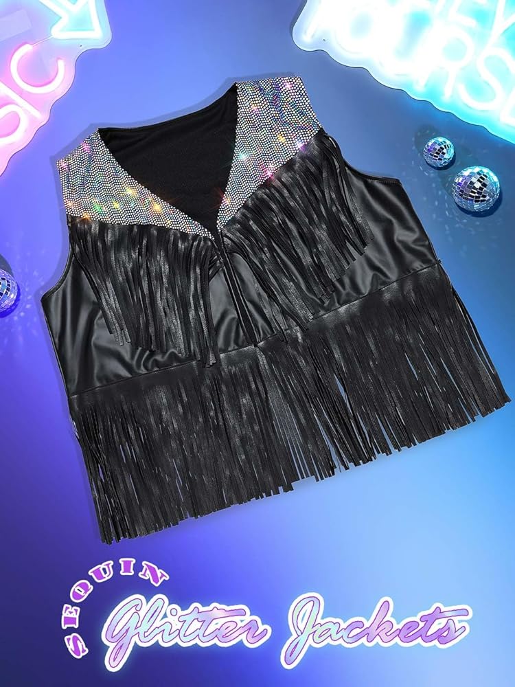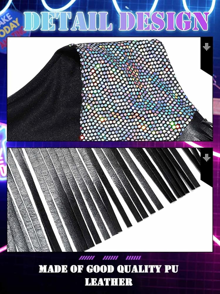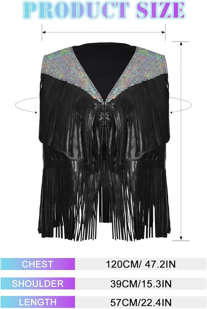 الجزء العلوي ذو الشراشيب مصنوع من جلد البولي يوريثان عالي الجودة والترتر الملون والنسيج ناعم وصديق للبشرة ومسامي وخفيف الوزن، مما يخلق سترة مريحة مع ثنية جيدة للنساء.
