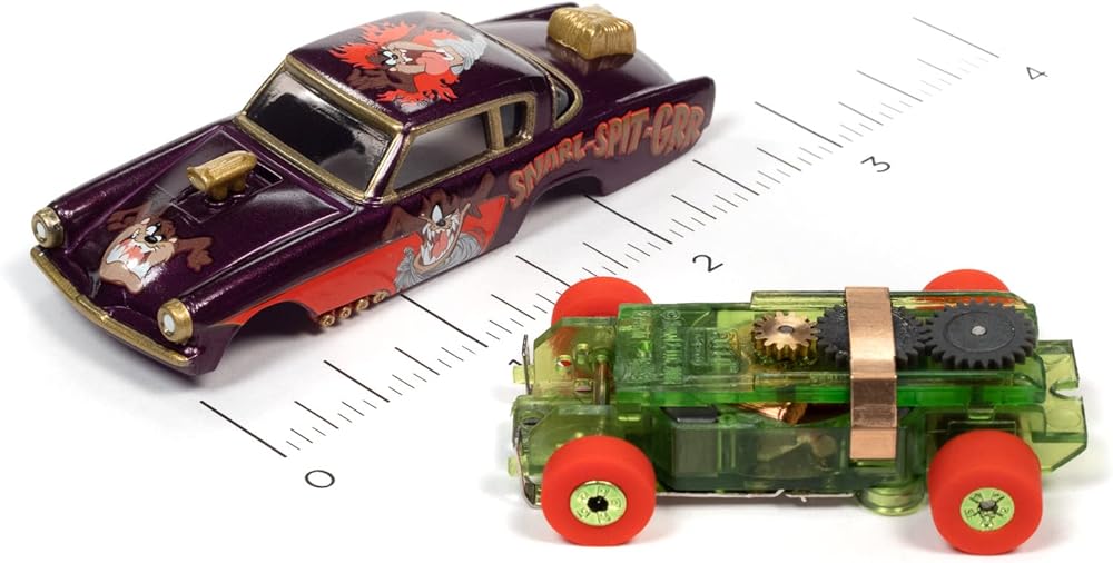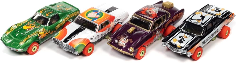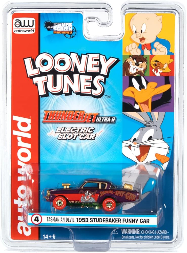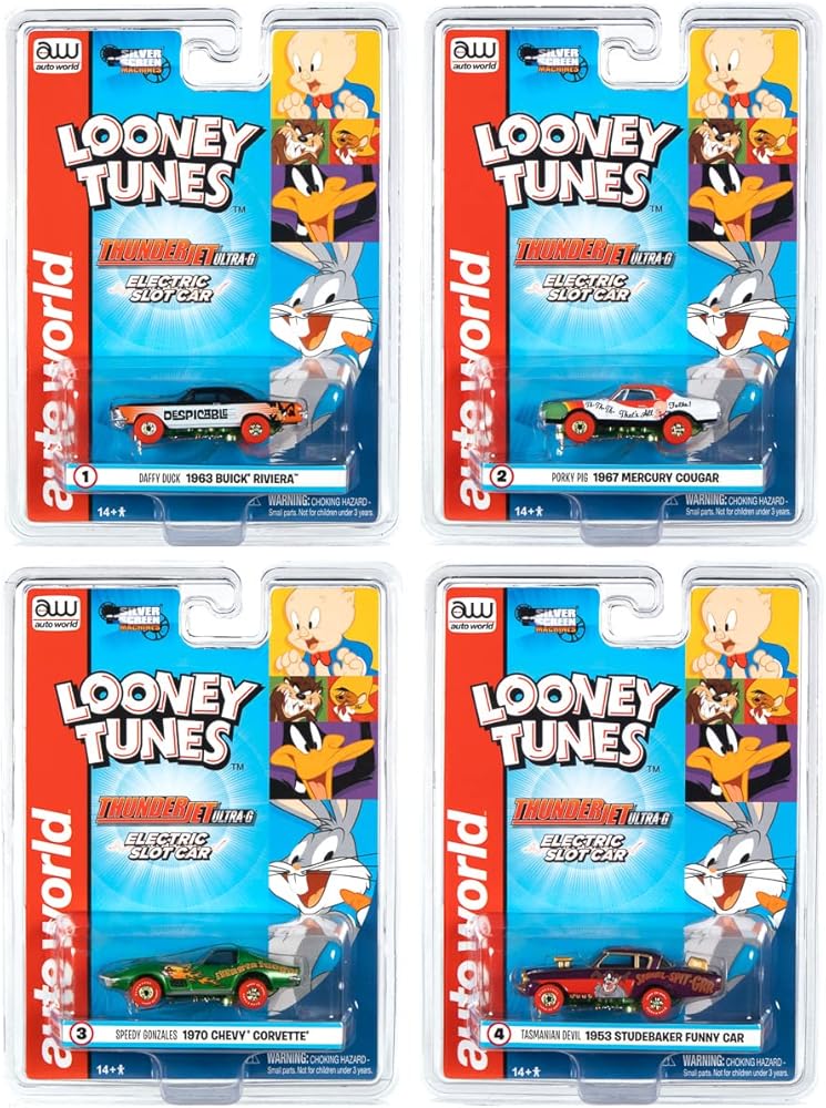 Auto World Thunderjet Release 33 Looney Tunes! Auto World's Looney Tunes slot cars are decked out with iconic Looney Tunes character art. The ThunderJet Ultra G chassis provides all the power these tiny toons need! Daffy Duck, Porky Pig, Speedy Gonzales and Tasmanian Devil are ready for a zaney race around the track!