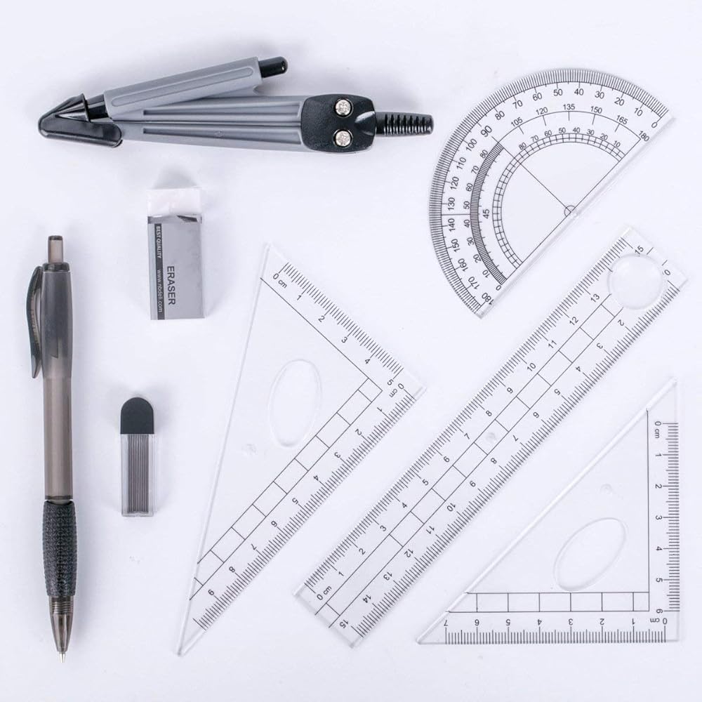 Package Includes:1 pencil, 1 pencil lead refills, 2 triangle rulers,1 straight ruler, 1 protractor,1 graphic compass and 1 white eraser.