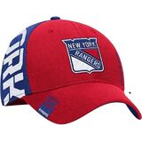 THIS IS A RED FRONT HAT WITH A BLUE BACK AND NEW YORK IN WHITE DOWN THE SIDES. THE RANGERS LOGO IS EMBROIDERED AND RAISED ON THE FRONT WITH REEBOK STITCHED IN BLUE ON ONE SIDE. A BLACK AND WHITE NHL LOGO IS ON THE BACK. PRINTED ON THE BILL IS BLUE IS NINTEEN 26 AND RANGERS IN WHITE.