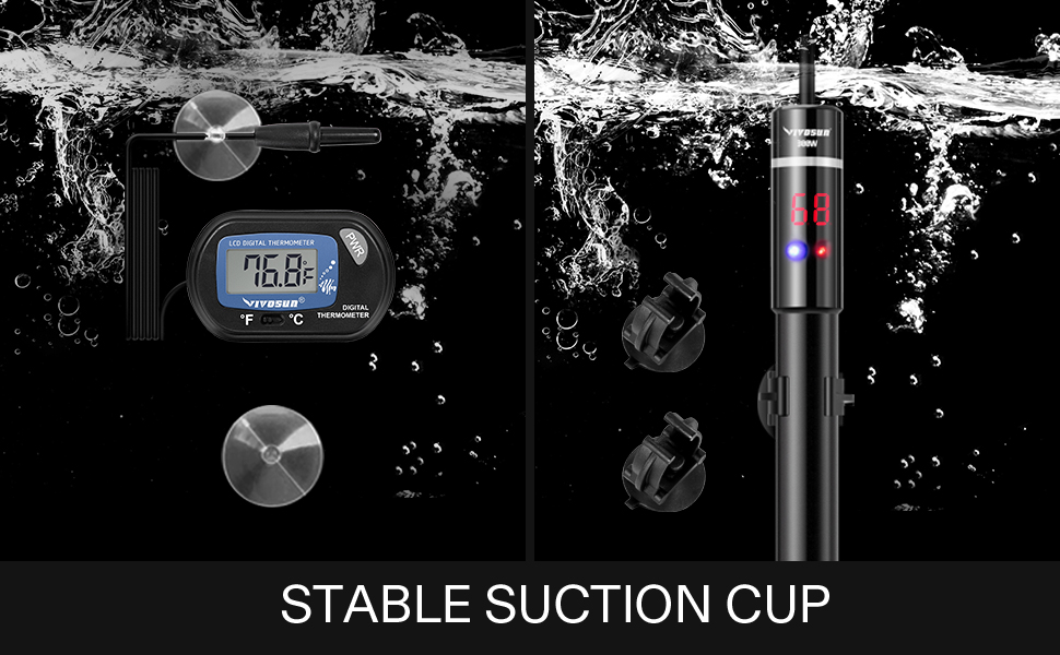 خيارات تركيب متعددة: تم تجهيز كل من مقياس الحرارة والسخان بأكواب شفط حتى تتمكن من تثبيتهما على جدار الخزان في أي مكان تريده؛ يمكنك ضبط درجة الحرارة المحددة دون إخراج السخان من الماء؛ يمكن لأسماكك السباحة بحرية عندما يتم تثبيت السخان على الحائط بقوة