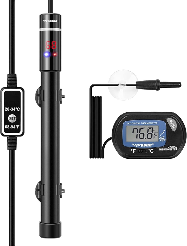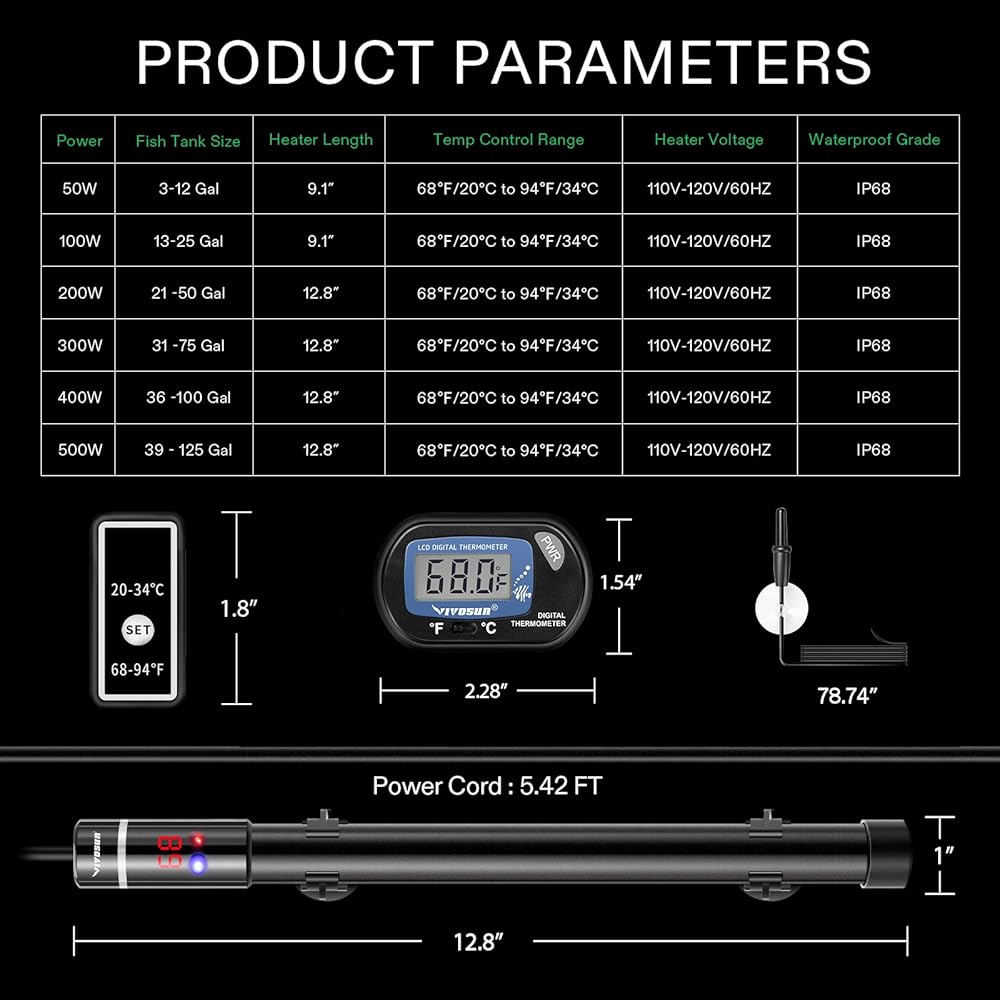 شاشة LED وكابل طويل: مع شاشة LED على السخان وشاشة LCD على مقياس الحرارة، يمكن قراءة كل من المجموعة ودرجة حرارة الماء بسهولة؛ كابل طويل للسخان يسمح لهم بالعمل بشكل جيد مع الخزانات الكبيرة