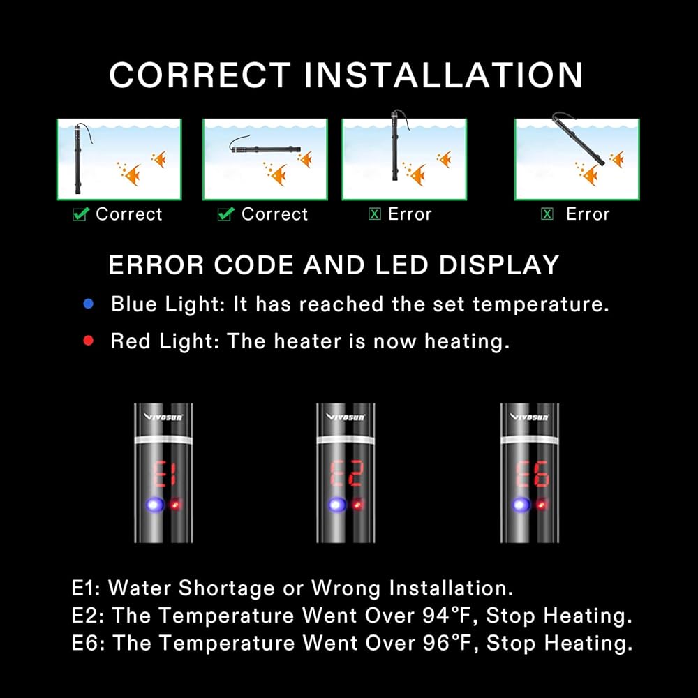 التحكم الدقيق في درجة الحرارة: مع شريحة IC الذكية، يمكن للسخان التحكم الدقيق في درجة الحرارة، والتي تكون ضمن ±1 درجة مئوية/±2 درجة فهرنهايت؛ يمكن أن يحافظ مقياس الحرارة على هامش الخطأ أقل من +/- 1 درجة مئوية؛ عندما يصل السخان إلى درجة الحرارة المحددة أو يتم إخراجه من الماء، فإنه سيتوقف عن التسخين تلقائيًا؛ سيوفرون منزلًا آمنًا ومريحًا لأسماكك