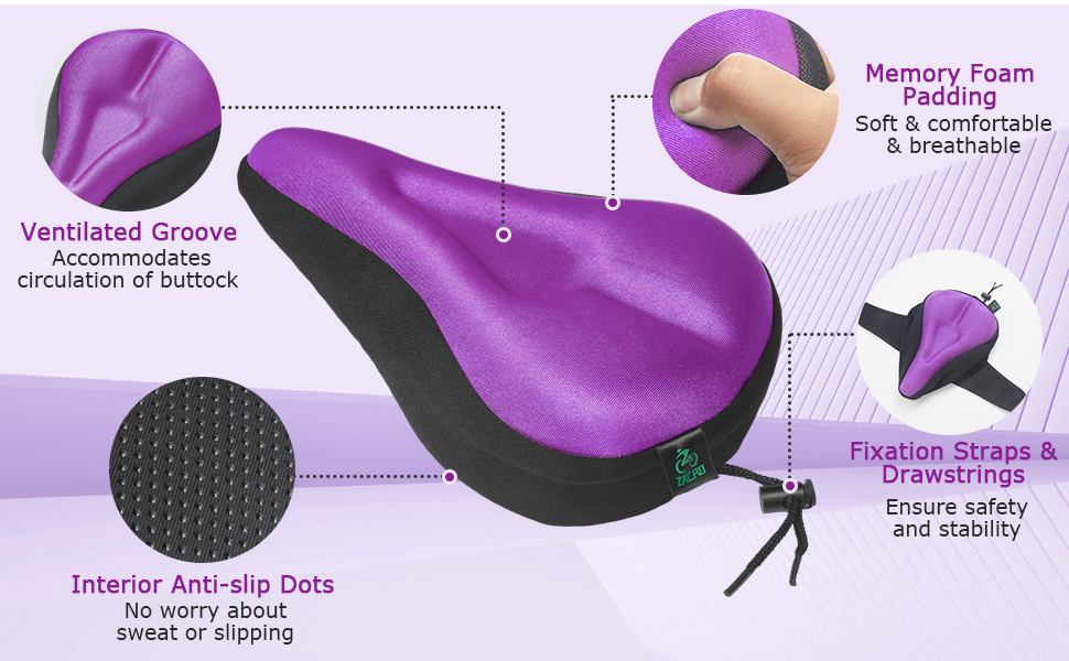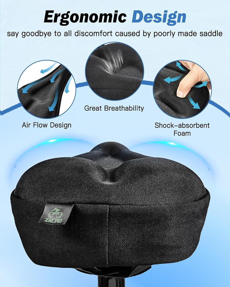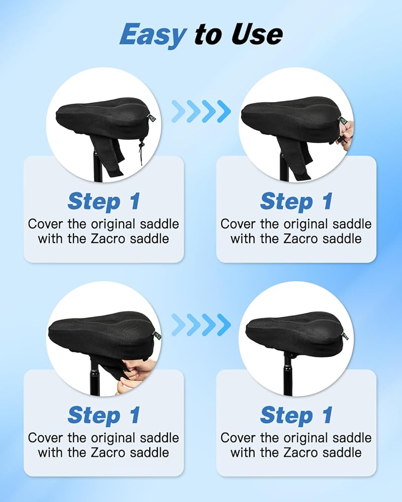 Ergonomic & Ventilation Design: The surface of the Zacro bike seat cover is made of breathable, moisture-wicking and quick-dry Lycra fabric. The secure stitches and sturdy fabric ensure that the cover won't easily rip or tear. The pressure relief channel in the middle of the cushion allows for perfect airflow, promoting heat dissipation and keeping riders cool and comfortable during their rides.