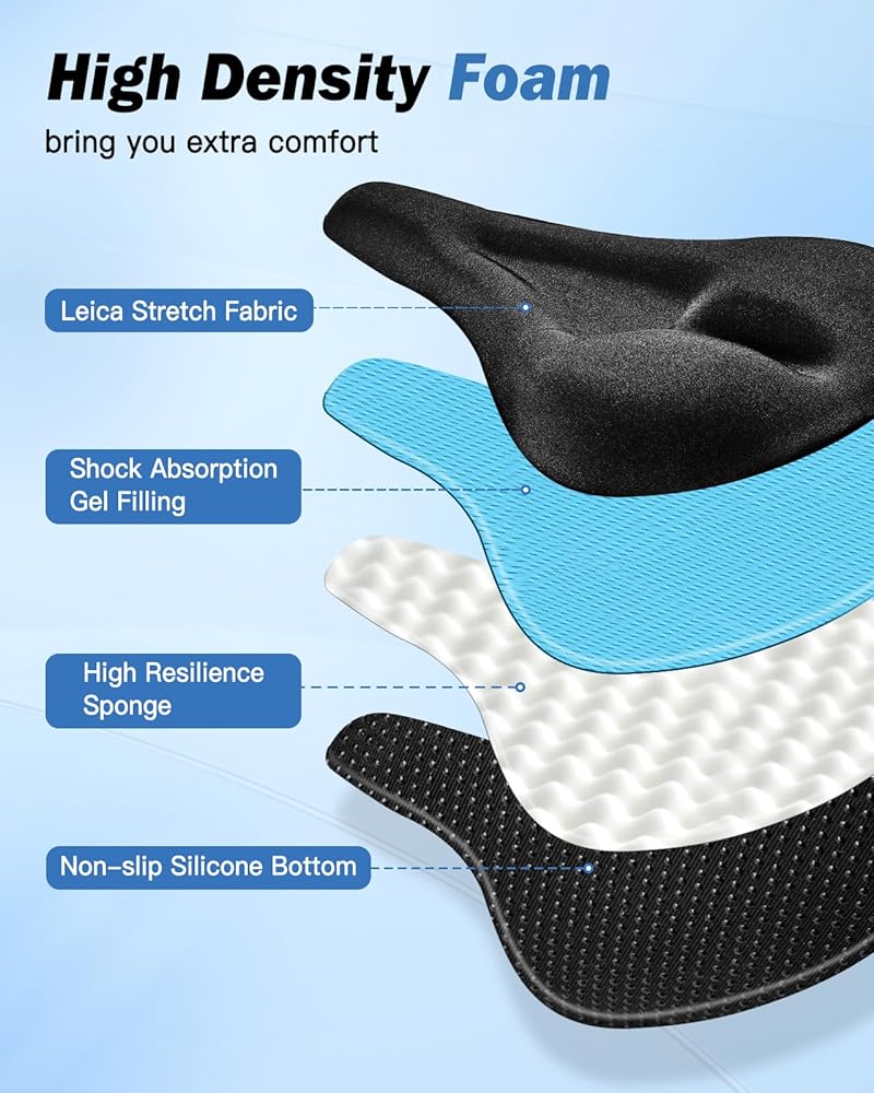 Velcro design & Better firmness : This bike seat cover fixed with Velcro binding design, can ensure the safety and firmness of cycling,no longer having to worry about sliding off the bike seat. The rear of the seat cushion adopts a drawstring design, easily to use and adjust. Moreover, The bicycle seat cover has anti slip silicone at the bottom, provides superior grip and stability.