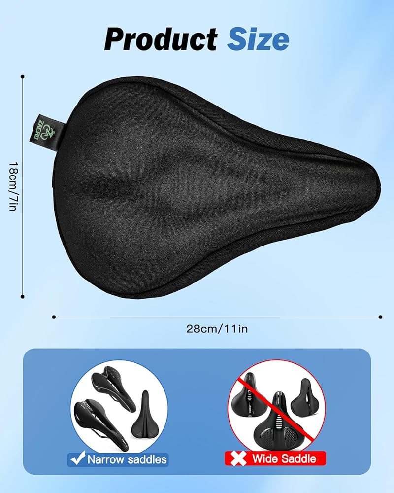 Size & Compatibility: Our gel seat saddle dimension is 11*7inch, fit for spin class/peloton/nordictrack etc indoor stationary cycling spinning bike, and also fit for outdoor mountain MTB/road/commuter/cruiser comfort cycle. Please confirm this bike seat cushion can fit your original bike seat before ordering.