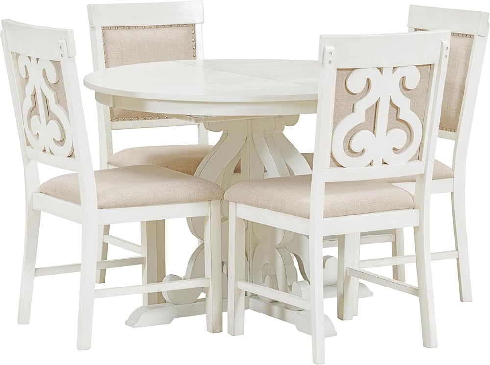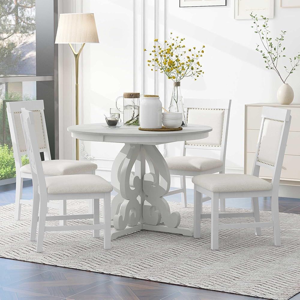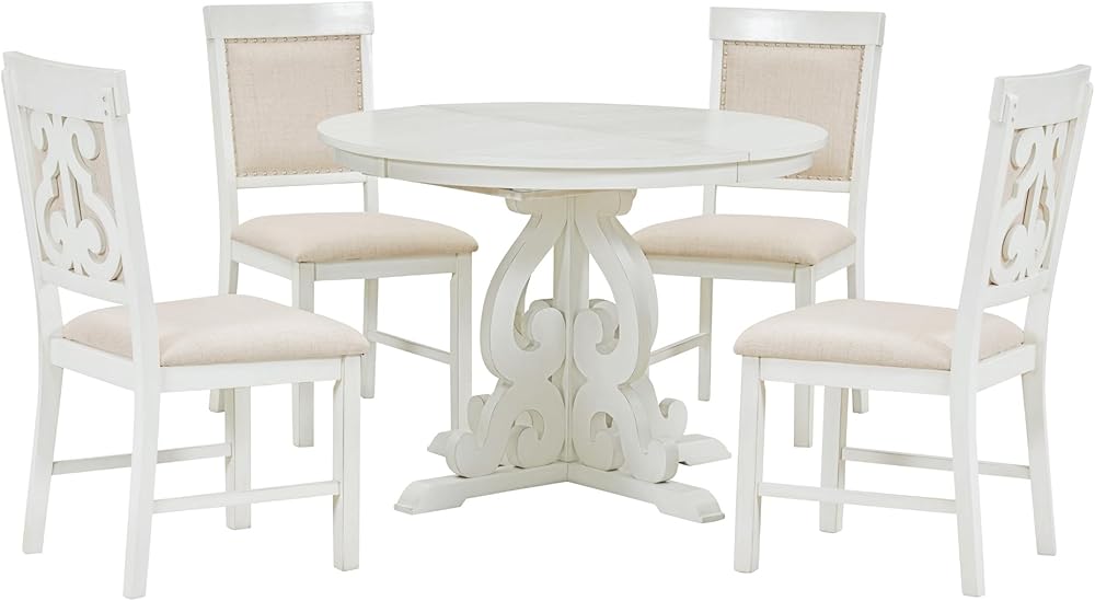 طقم طاولة طعام مستديرة بنمط عتيق من 5 قطع من HAUSHECK لـ 4 أشخاص، سطح طاولة قابل للتمديد قابل للتعديل مع 16 ورقة وأربعة كراسي منجدة لأثاث المطبخ، زاوية الإفطار، أبيض عتيق