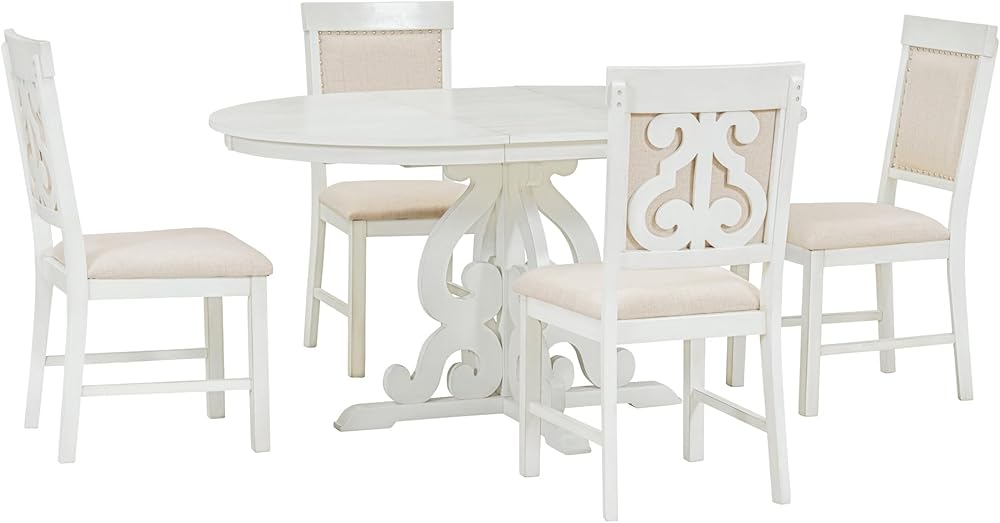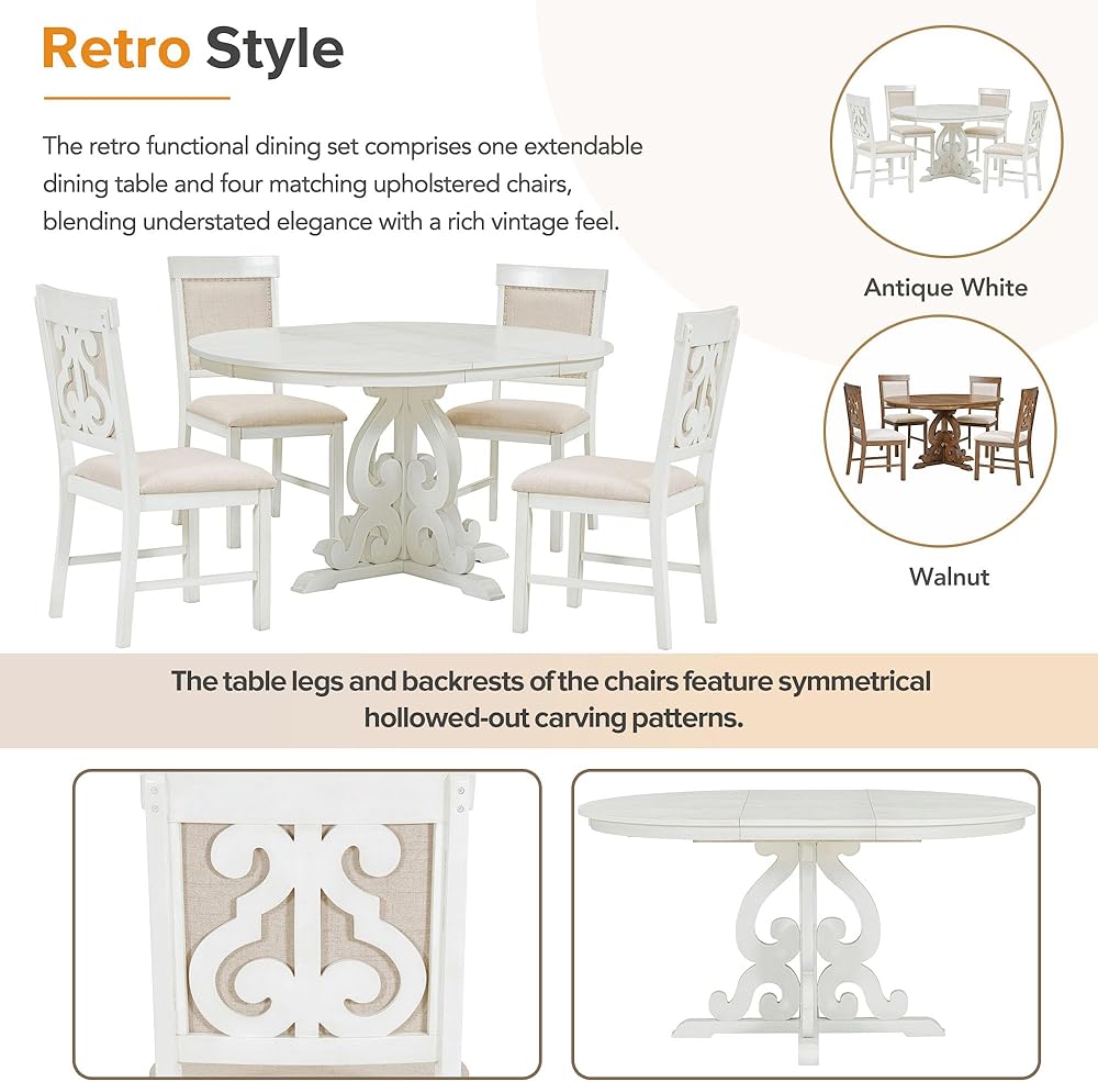 Retro Style Dining Set for 4 - The retro functional dining set comprises one extendable dining table and four matching upholstered chairs, blending understated elegance with a rich vintage feel. The table legs and backrests of the chairs feature symmetrical hollowed-out carving patterns. It's available in two colors, antique white and walnut. No matter which color dining set you choose, it will be the crowning touch of your restaurant, kitchen or dining room.