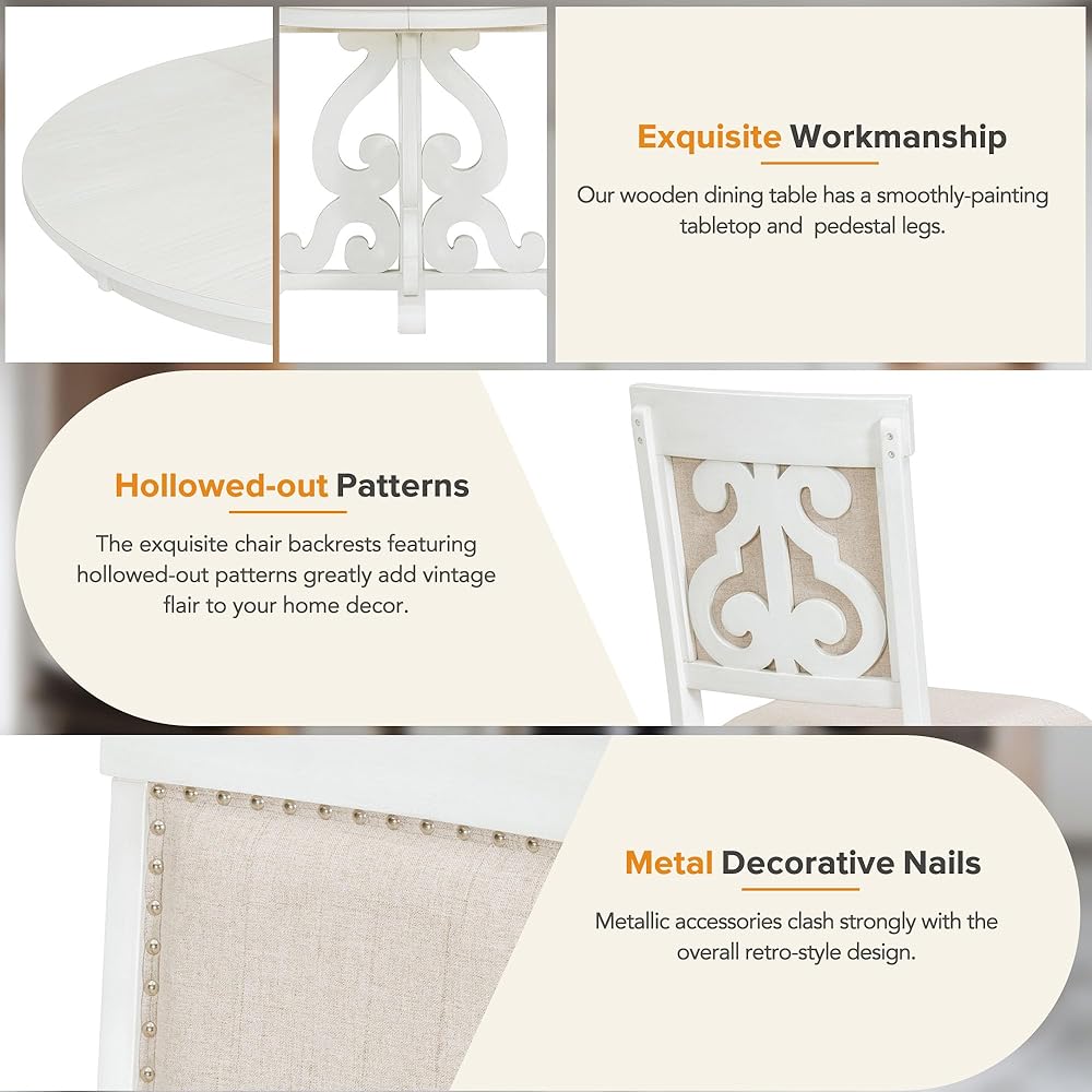 Exquisite Workmanship - Our wooden dining table has a smoothly-painting tabletop and pedestal legs. In the design of the meticulous and gorgeous symmetrical curved pattern, the table is full of a retro flair. Moreover, the exquisite chair backrests featuring hollowed-out patterns and metal decorative nails greatly add vintage flair to your home decor.