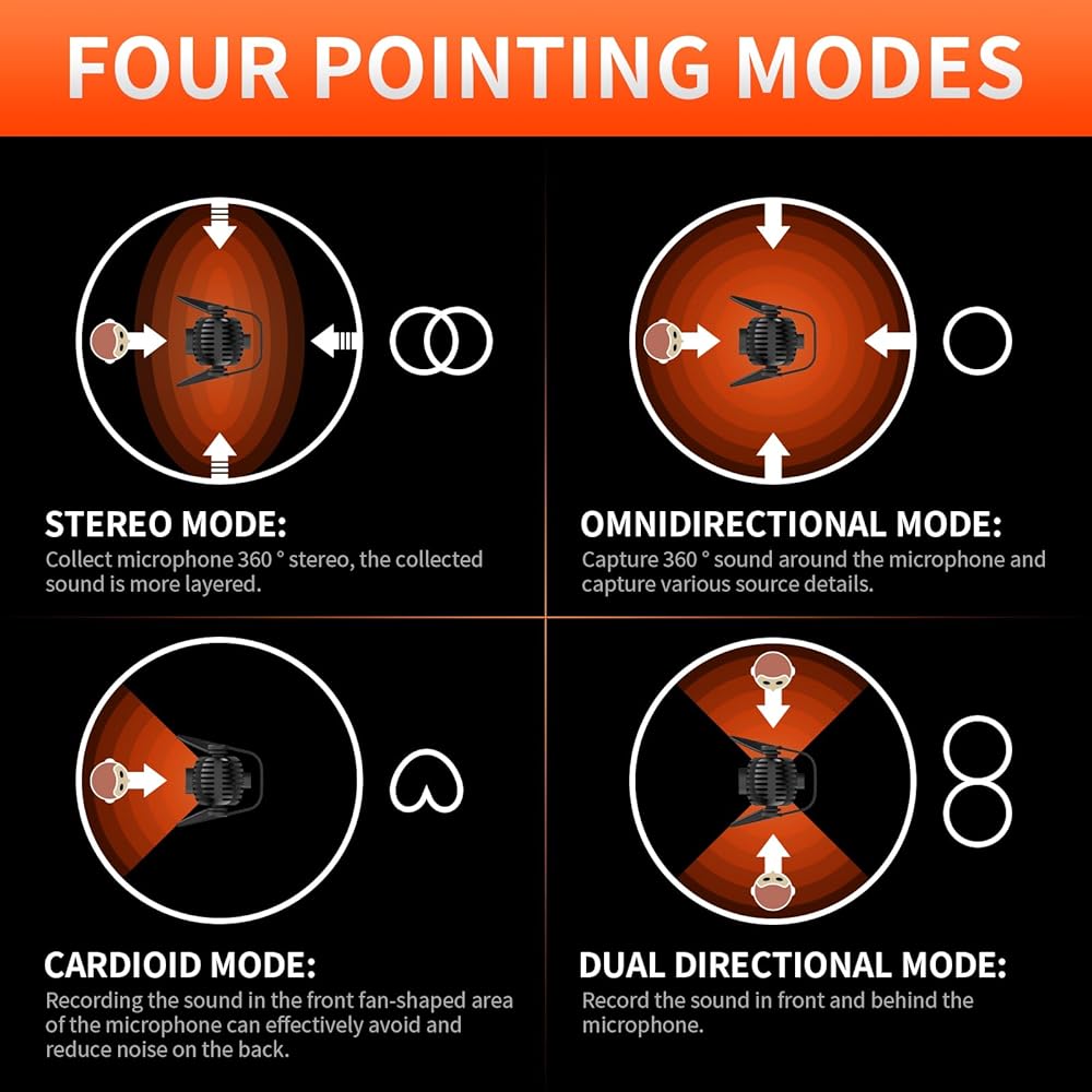 أنماط التقاط متعددة لتحقيق أقصى قدر من المرونة: اختر من بين مجموعة من أنماط الالتقاط القابلة للتحديد — استريو، وقلبية الشكل، ومتعددة الاتجاهات، وثنائية الاتجاه — للتكيف مع سيناريوهات التسجيل المختلفة وتحقيق جودة صوت رائعة.