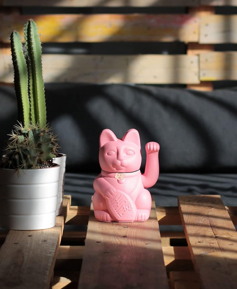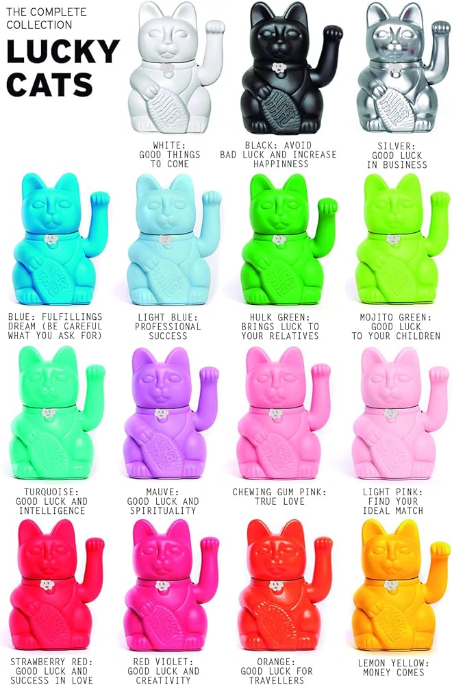 Lucky Cat "Gatete" is the elegant version of the classic luck of the cat, fortune cat or Maneki-Neko. Meaning of each color: BLUE: Fulfilling dreams (Be careful what you ask for) MALVA: Freedom, power and love SOFT PINK: find your ideal match ORANGE attracts luck, fortune for travelers BLUE SOFT: professional success GREEN HULK: Attract luck to your relatives SOFT GREEN: Fertility. Good luck to your children RED: Good luck. Success in love YELLOW: Money comes. Good luck. TURQUOISE: Good luck and intelligence BLACK: Avoid bad luck and increase happiness SILVER: Good luck in business WHITE: Purity, good things to come PINK: True love RED VIOLET: Ingenuity and Creativity Characteristics Hand painted Material: plastic Size: MEDIUM: 10x6x15cm. Waving arm Powered by AA batteries (1.5V) NOT INCLUDED