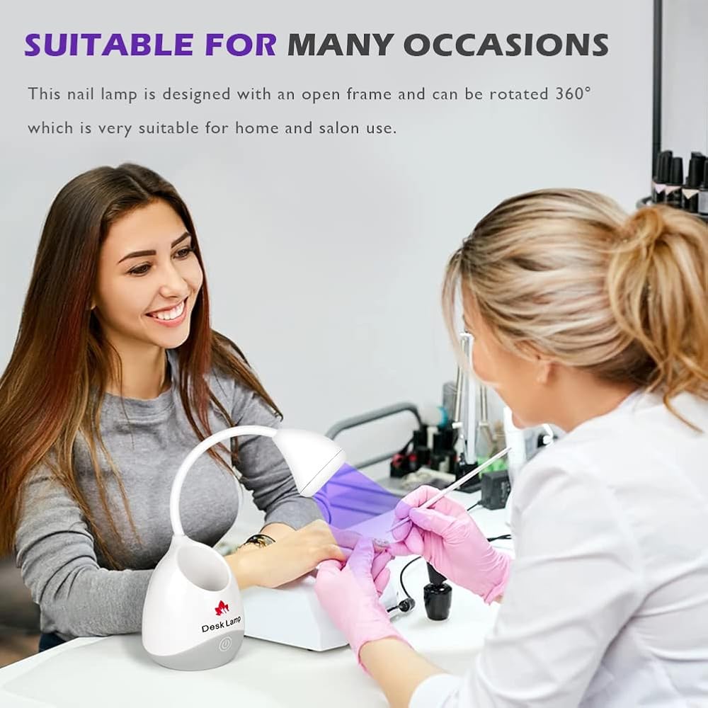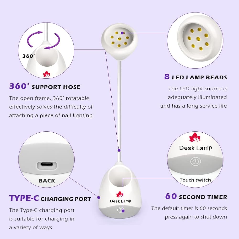 【360° Rotatable Hands-free Nail Light】Our Gooseneck UV nail lamp is designed with a 360 degree adjustable gooseneck, flexible neck allows for complete range of motion, easy to use in anywhere. the default lighting time is 60S, low calorific value and will not harm your skin and eyes. Cute gift for your family and friend.