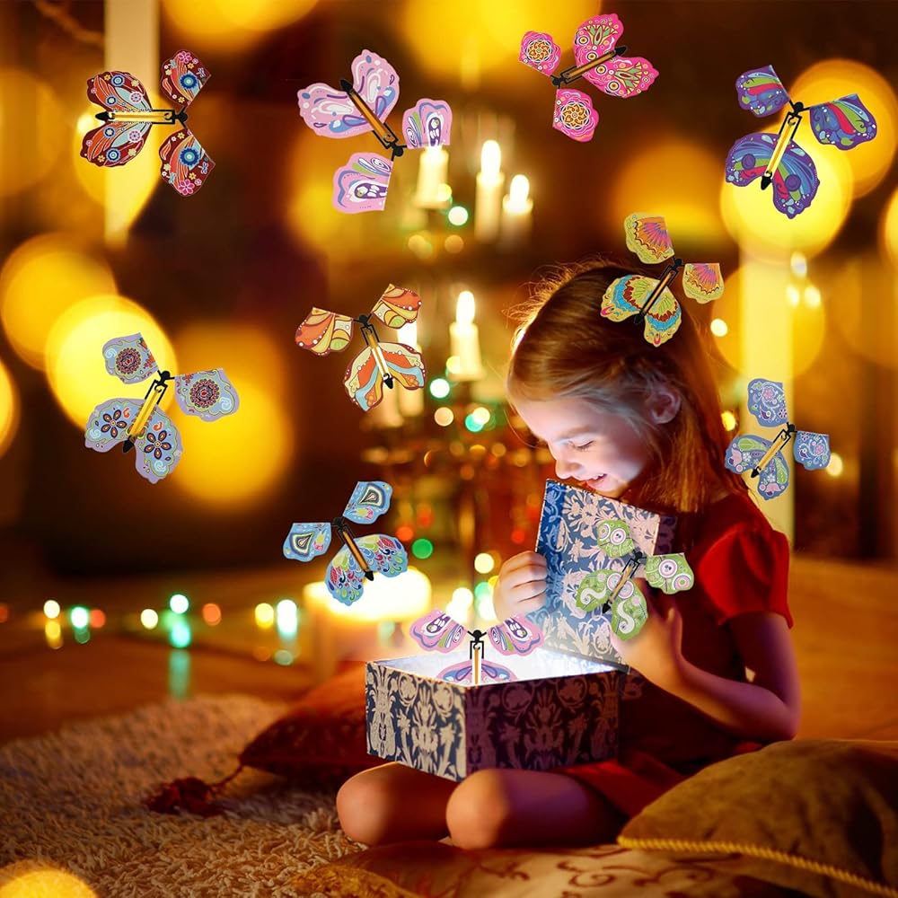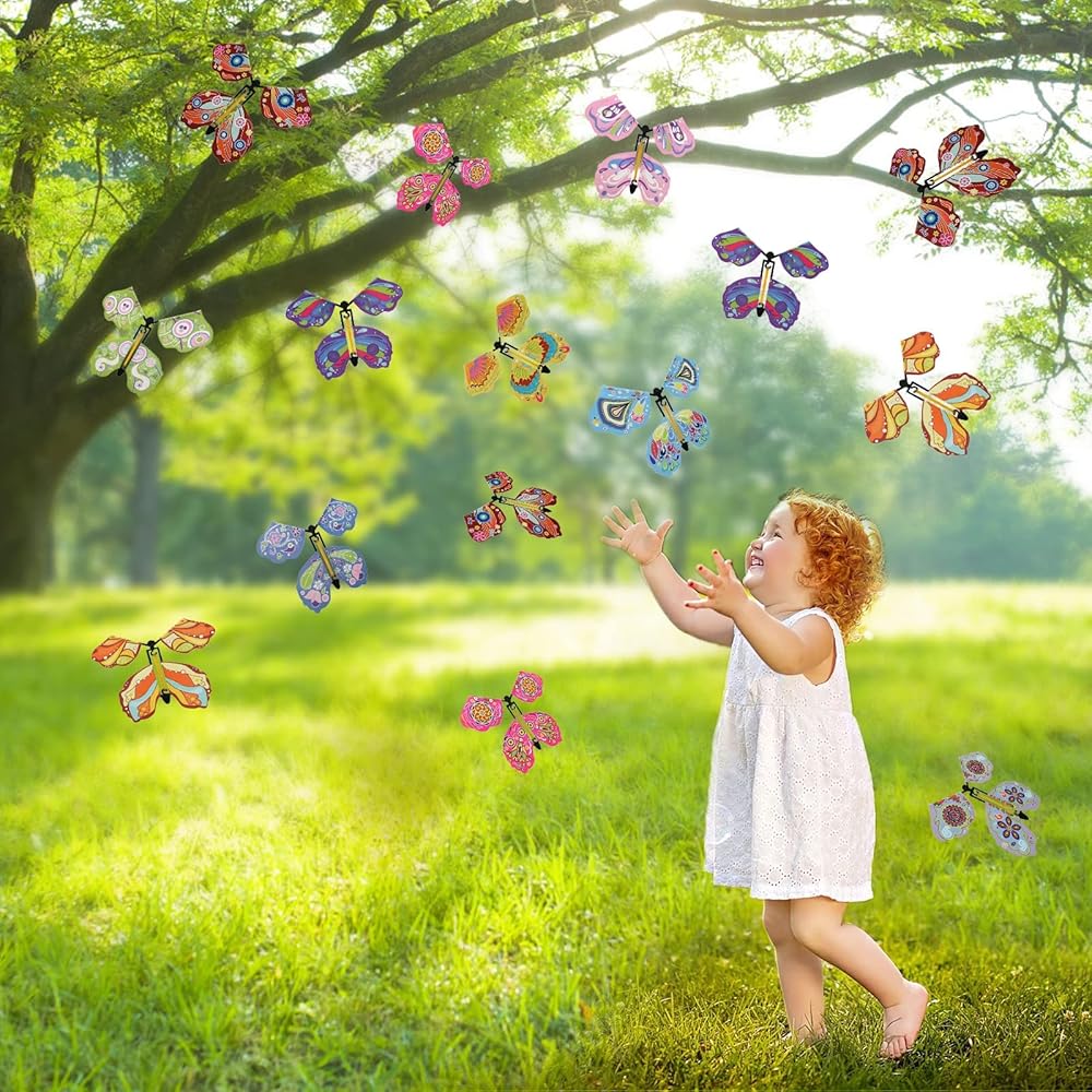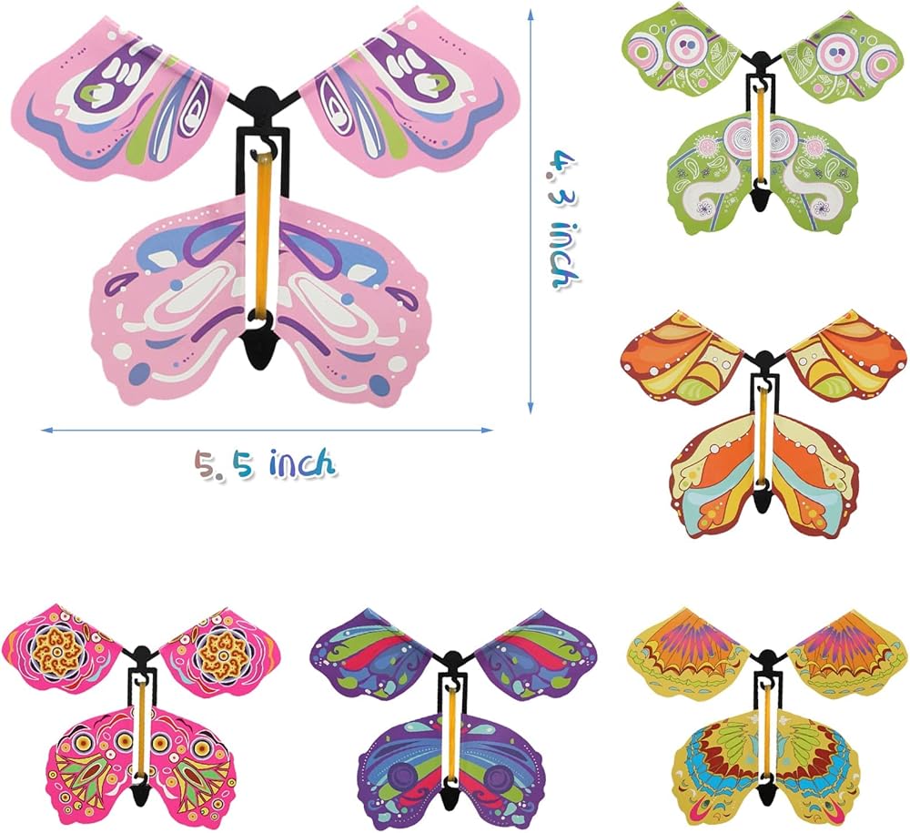[Surprise Gift]: Our Wind up Rubber Band Powered Butterfly Toys has 30 Piece, you can play with your friend or your family, enjoying the happy moment. Also, it also can be a novel gift. Flying Butterfly can used as bookmark, decoration for greeting cards, or a perfect gift for girls and boys.
