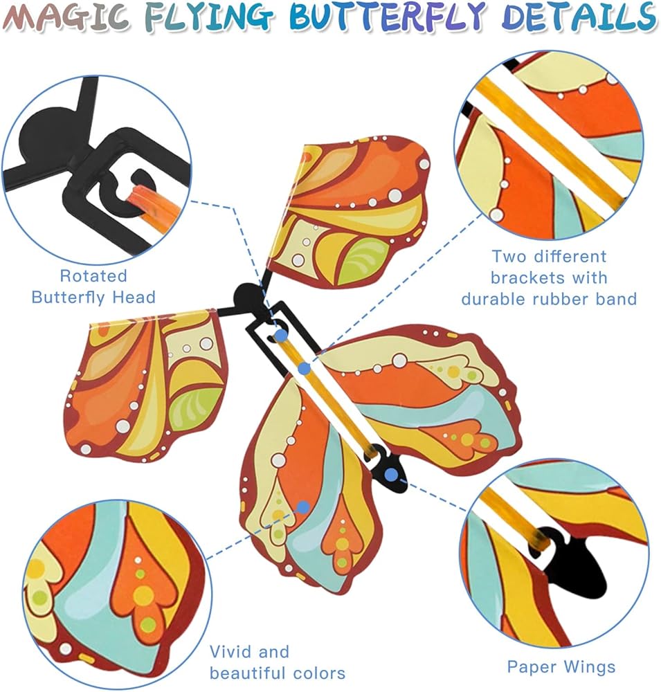 [High-Quality]: The Butterfly Wings are made of cardstock, which is very flexible, rotating the rubber band by clockwise or anticlockwise, The butterfly will fly, different types and colors are available.