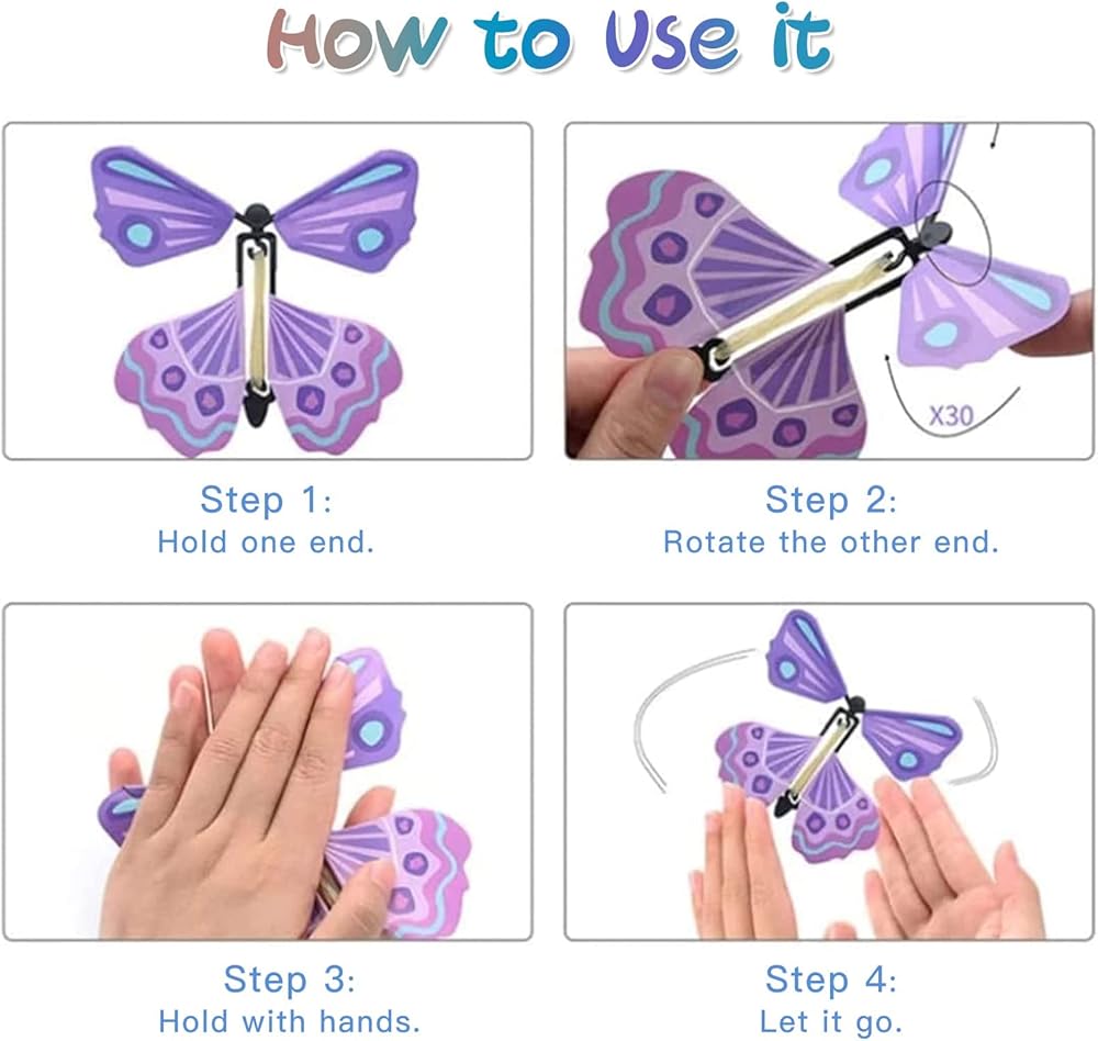 [How to Use]: First, hold the tail of the butterfly with your left hand, then rotate the head of the butterfly about 30-50times with your right hand, third Loosen the butterfly. You can also put the butterfly toy in a book or a card, when you open it, the beautiful butterfly will fly out.