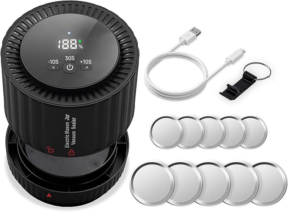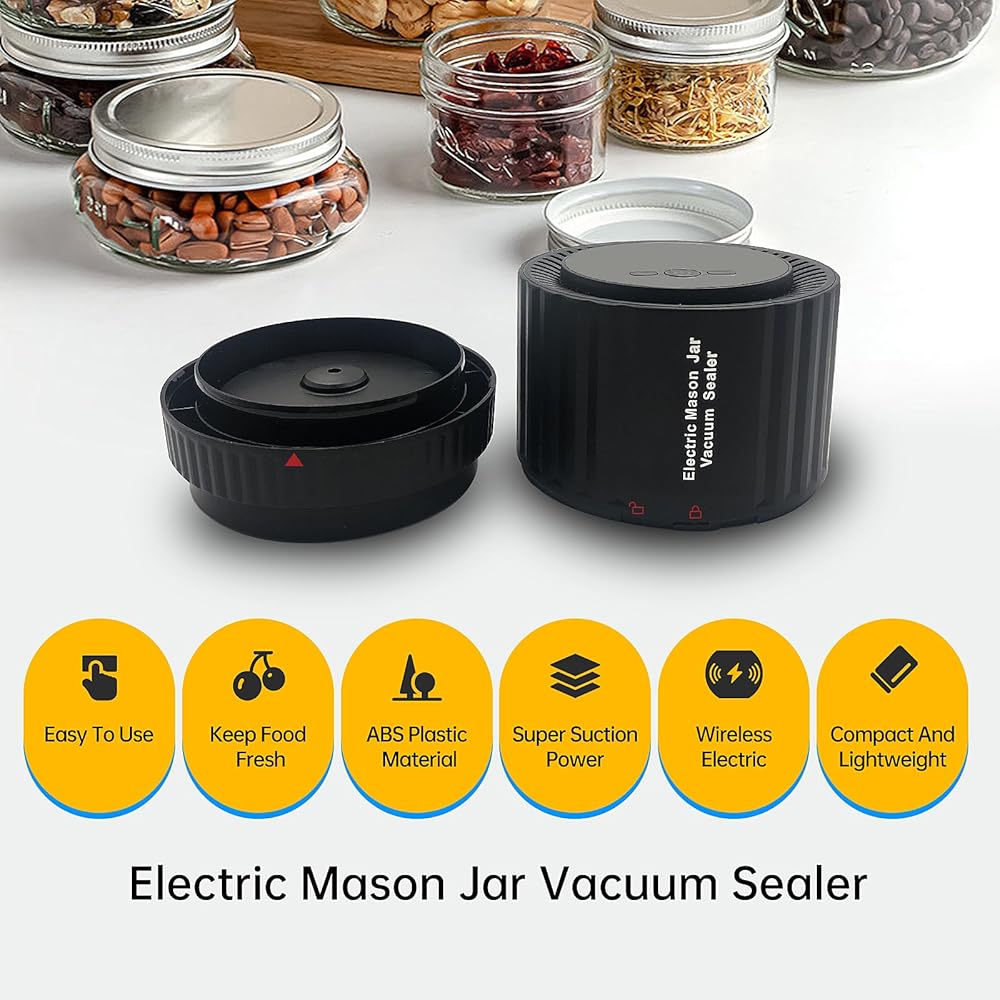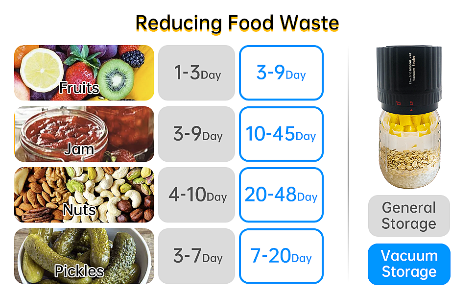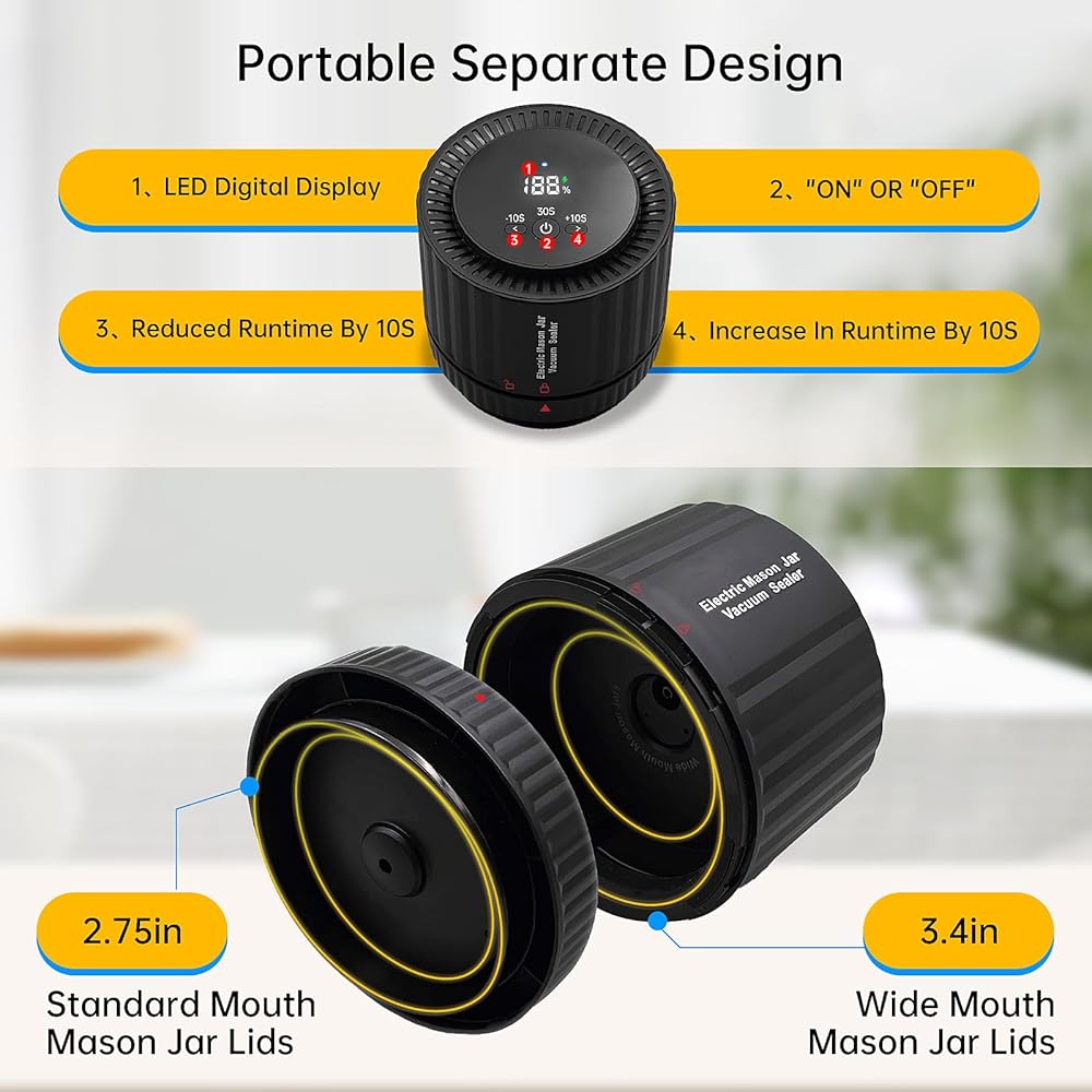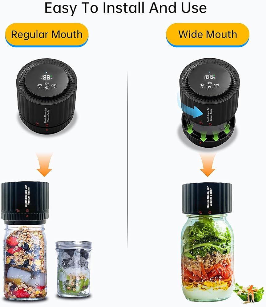 【سهلة الاستخدام】إن مانع التسرب مناسب للفم العريض والبرطمانات الماسونية ذات الفم القياسي. تأكد من أن مانع التسرب في المنتصف ومحكم على الغطاء، انقر فوق زر التشغيل/الإيقاف لبدء مضخة التفريغ لمدة 30 ثانية وسيتم ضخ الهواء إلى مانع التسرب. اضغط على الزرين الأيسر والأيمن مرة واحدة لتقليل أو زيادة وقت تشغيل مضخة التفريغ بمقدار 10 ثوانٍ، وسيؤدي النقر فوق زر التشغيل/الإيقاف مرة أخرى إلى إيقاف تشغيل مانع التسرب وعرض الشحنة المتبقية.